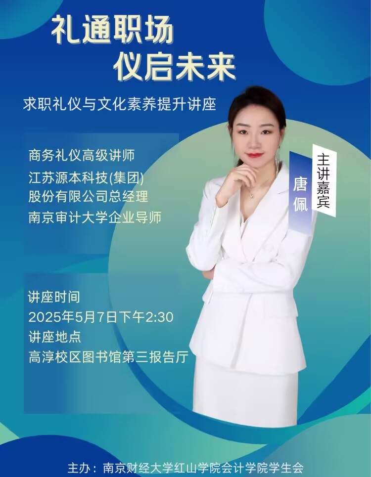 主讲嘉宾:唐佩,商务礼仪高级讲师,江苏源本科技(集团)股份有限公司总经理,南京审计大学企业导师。