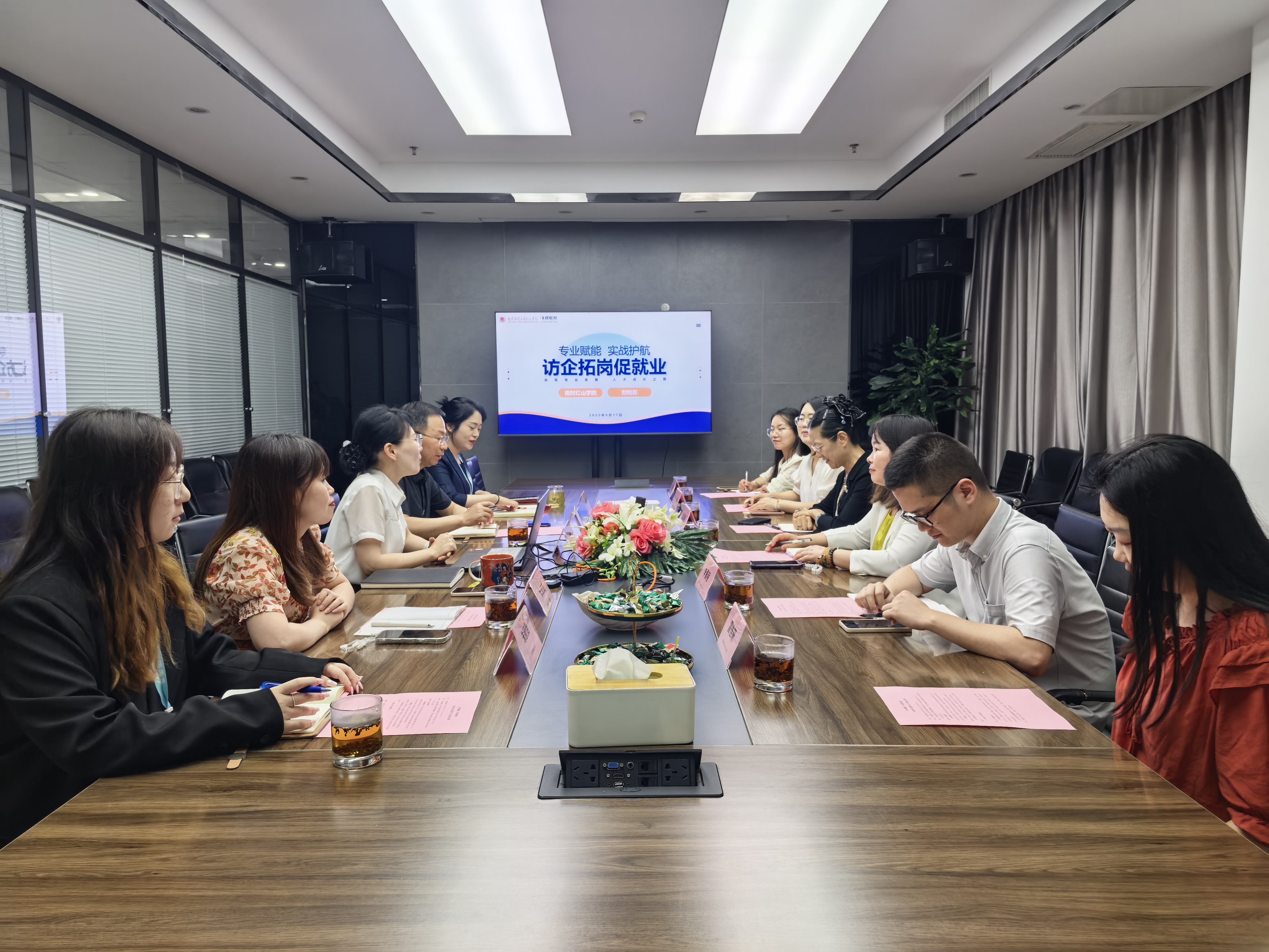 为精准对接企业用人需求,优化人才培养方案,推动毕业生高质量就业,6月11日下午,学院党委副书记、副院长、会计学院党总支书记王晨婷带队赴江苏财税邦科技有限公司开展“访企拓岗促就业”专项活动。会计学院院长孟翠湖、党总支副书记王颖、团总支书记李景程、党总支宣传委员王亚莉及辅导员雷佳研陪同。财税邦总经理高霞、创始人毛友俊、商务运营中心总监杨青、产学研中心总监张苗苗、项目经理朱秋怡热情接待。