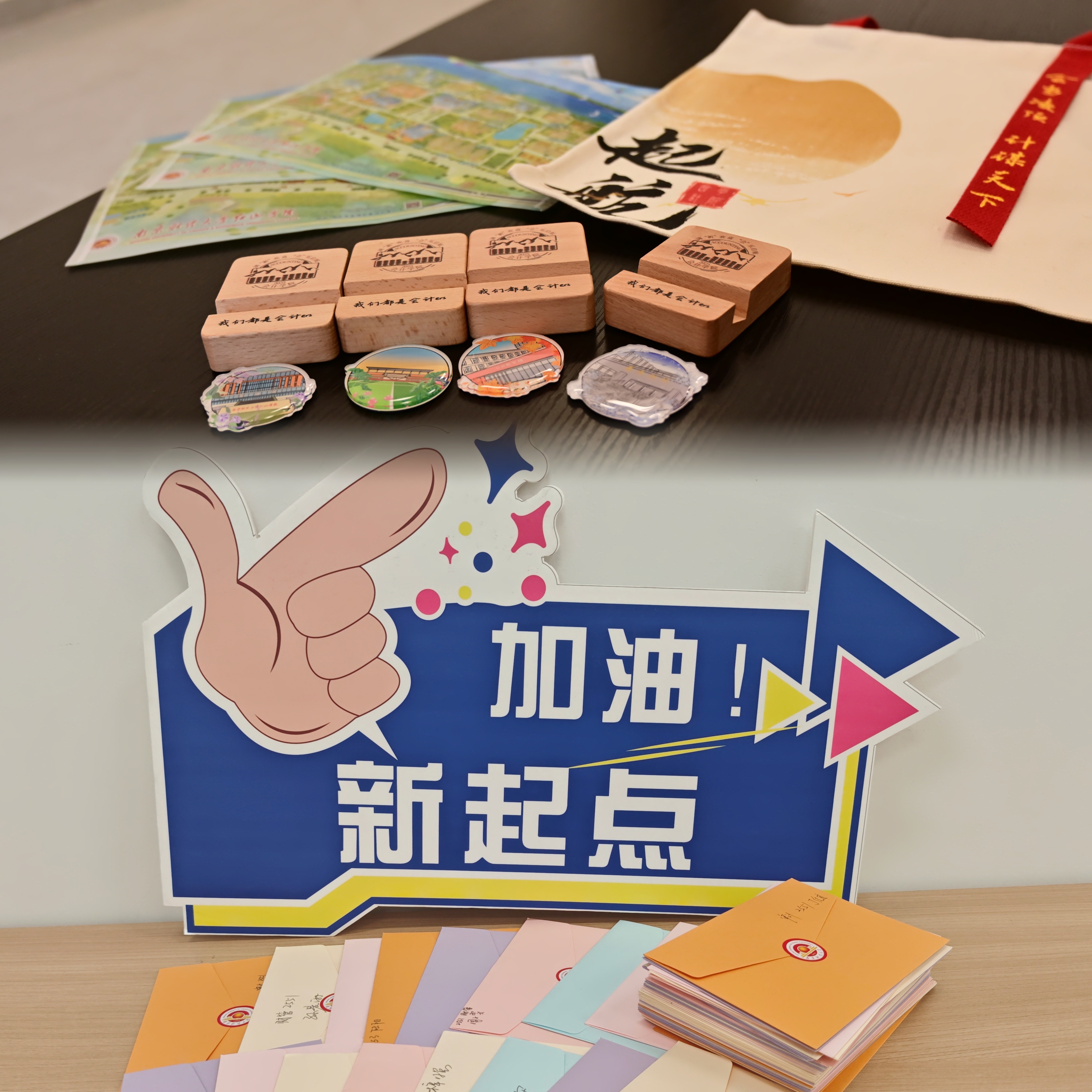 除扎实做好“基础保障”外,学院围绕“满‘新’欢喜,‘会’乐启航”主题,策划了多项充满心意与创意的迎新活动:定制帆布袋、冰箱贴、手机支架等实用文创,传递学院暖心关怀;开展“快问快答大闯关”,用趣味互动帮新生快速融入校园;而“四年之约——见字如面”活动尤为亮眼,新生通过给未来写信、投入“时光信箱”,在“时空对话”中主动梳理大学规划,让“被动听讲解”变为“主动立目标”的成长行动。