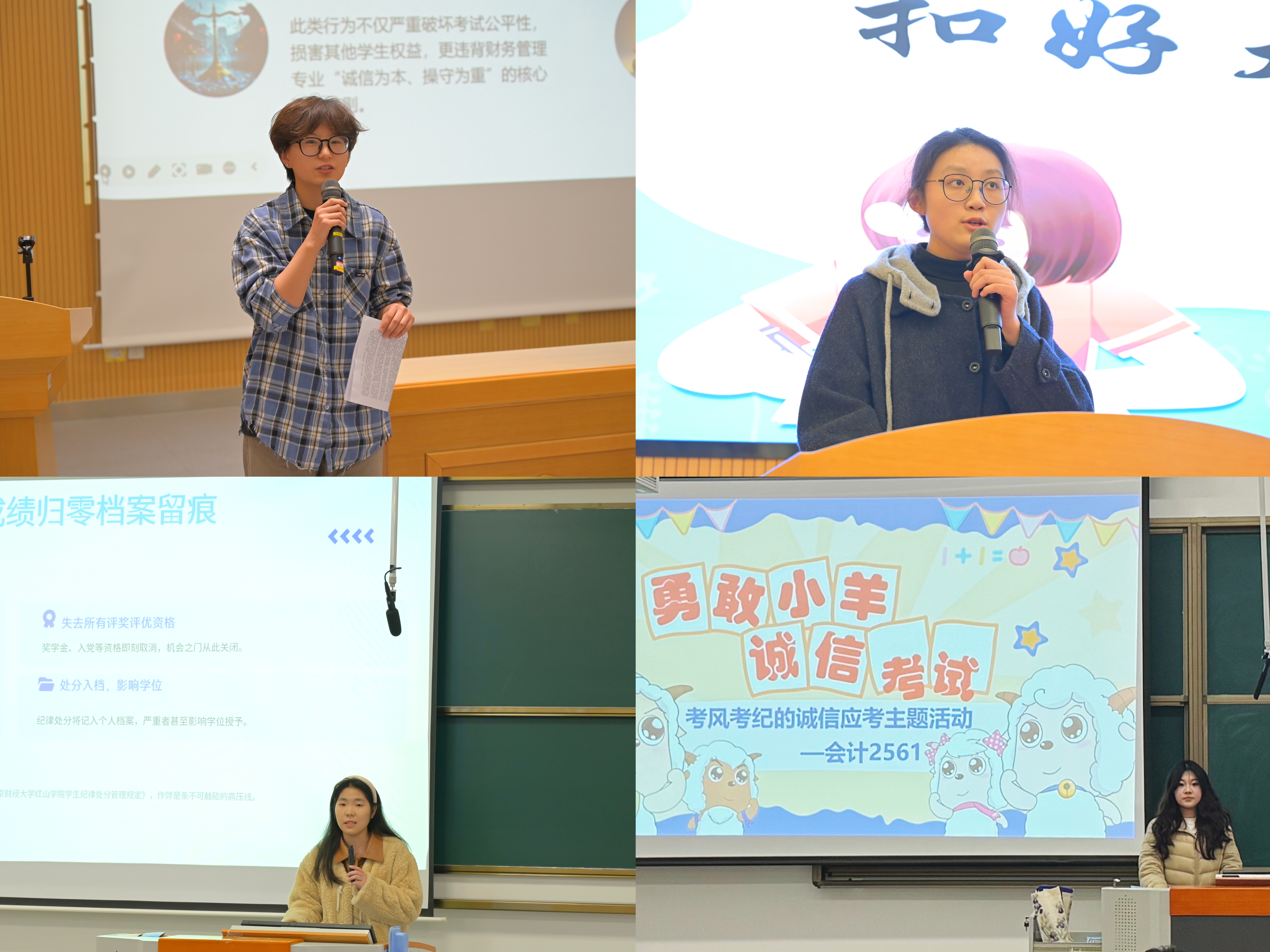 期末考季临近,为筑牢新生考风考纪思想防线,强化诚信应考意识,会计学院组织2025级财务管理、会计学、审计学三大专业开展诚信应考主题教育活动,以沉浸式、互动式、常态化模式筑牢学生思想防线。12月22日至24日,活动在新生辅导员杨静、陈朋、朱诚的指导下先后开展,由会计学院“心连心工作驿站”学生成员主持。