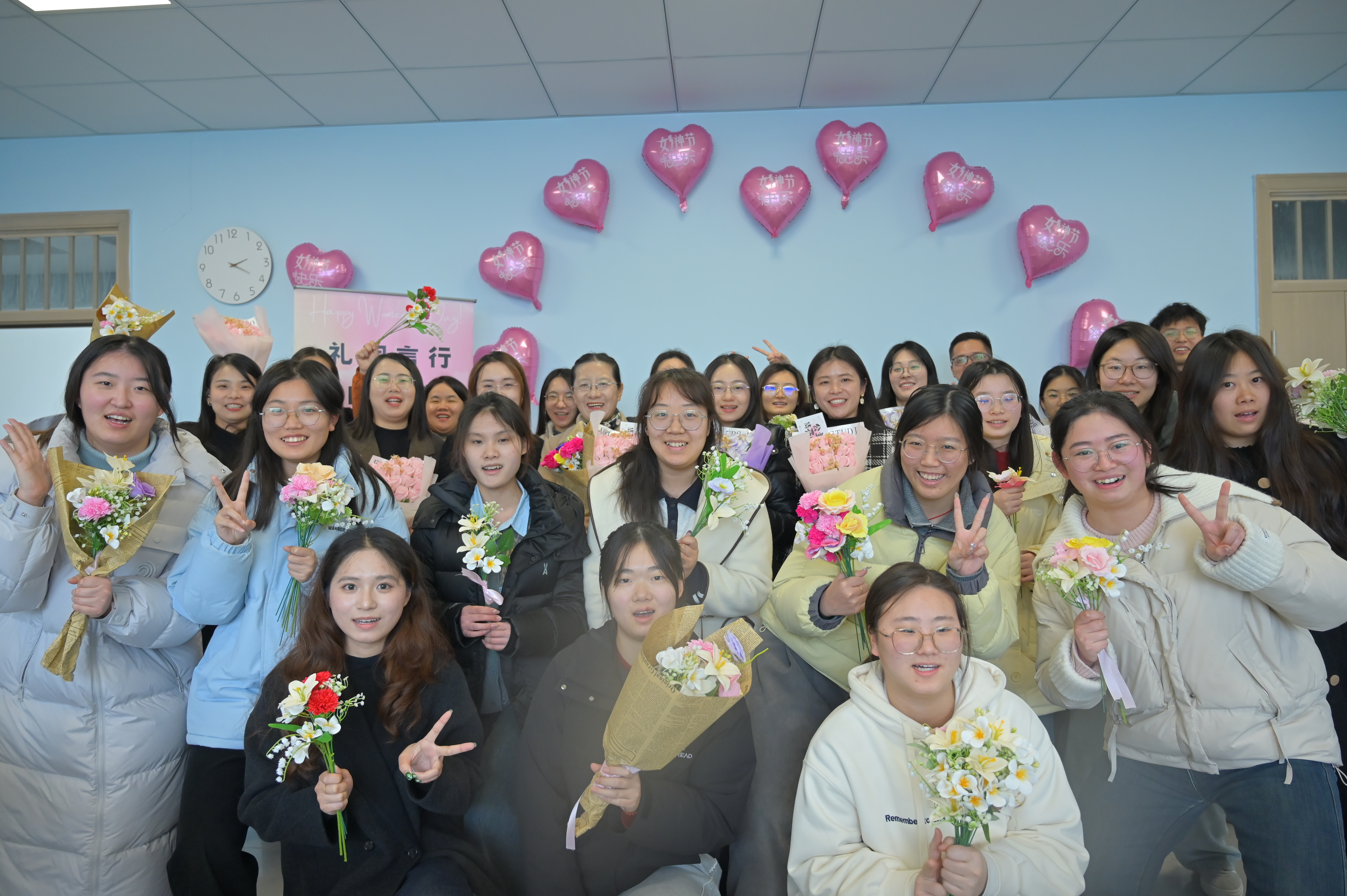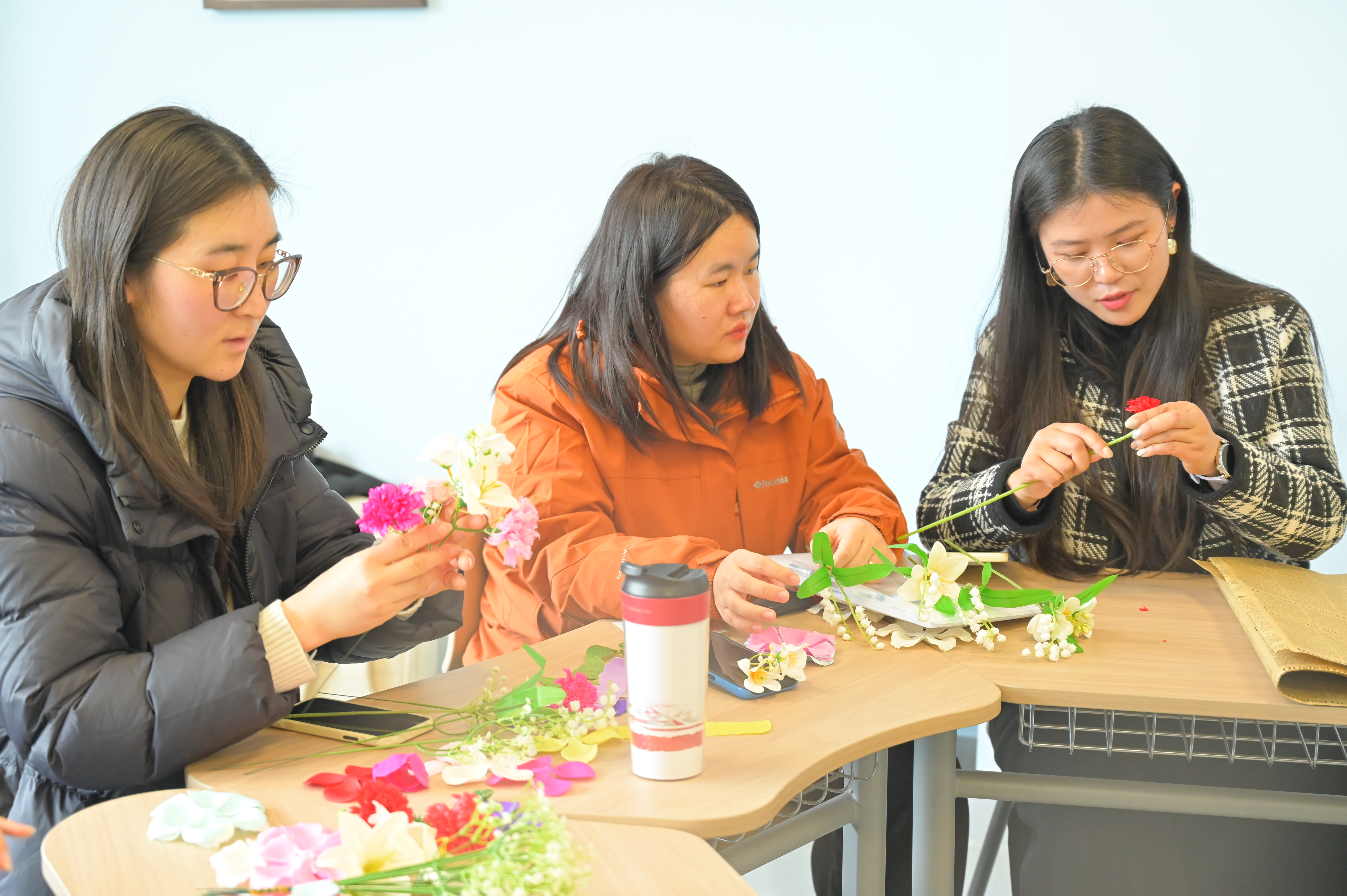 活动设礼仪、美妆、花艺三个环节。礼仪环节,胡雅雯老师围绕校园社交场景,细致讲解站姿、语言表达等基础礼仪,通过示范与互动引导大家以礼修身。美妆环节,审计2355班高静雯以“清透自然、简约得体”为原则,手把手教学美妆技巧,帮助师生提升自信。花艺环节,“以动‘会’心”辅导员工作室潘蒙蒙老师指导花材搭配与包扎造型,同学们融入所学,亲手制作节日花束,在指尖创作中诠释对美的理解。现场氛围轻松治愈,大家在交流协作中舒缓身心、增进情谊。活动尾声,师生手持花束合影留念,定格温馨时刻。