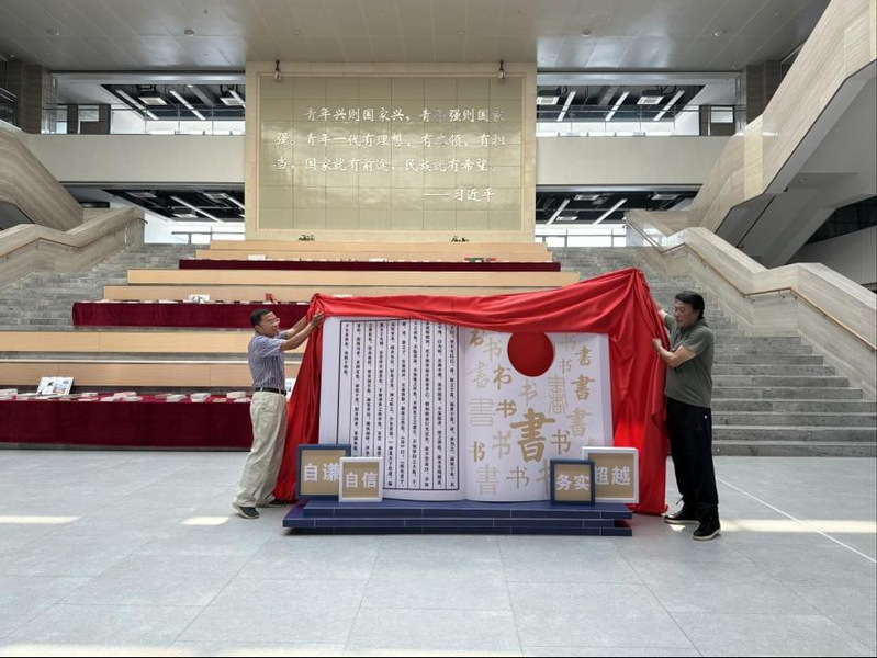 随后,戴昕副校长、白少布馆长为打卡点揭幕,这个融合线装古书造型与经典文句的全新打卡点正式亮相。
