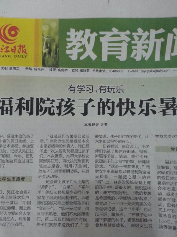 7月30日《吴江日报》报道开云官网6名学生组成的“温暖折翼天使”——关爱残障儿童,走进社会福利院爱心活动。
