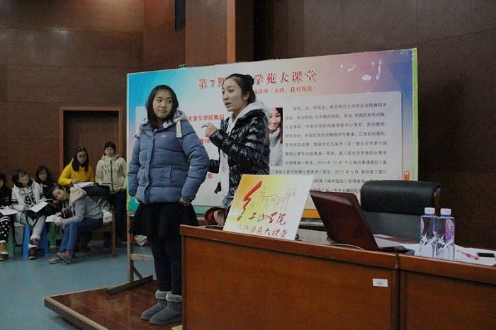 接下来,廖老师用轻松愉快的口吻和我们分享了她在练习舞蹈时的趣事,点明爱美需要想法、信心以及去做的动力,赢得了在场同学们由衷敬佩的掌声。最后是提问环节,面对“如何瘦大腿,瘦脸”、“如何挺直腰杆”等女生感兴趣的问题,廖老师耐心地一一给予答复。她认为跑步是瘦身的最佳方式,能够起到瘦身且强身健体的功效。至于如何挺直腰杆,廖老师说要通过背身曲体等方式来锻炼出挺拔身姿。提问环节结束后,此次讲座便也一曲而终,拉上了帷幕。