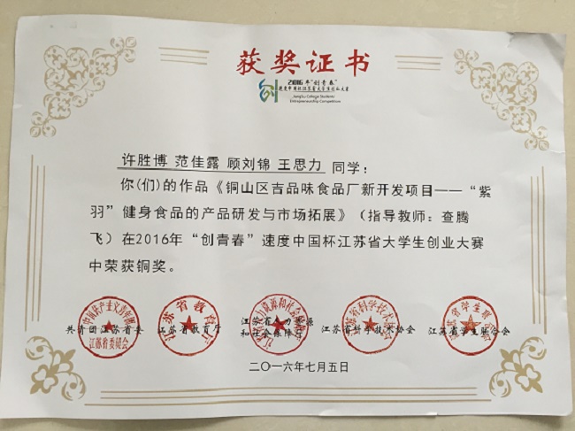 为了做好本次比赛的相关工作,院团委从4月初发布该项赛事通知开始,积极组织选拔、动员工作。选出4个项目参赛,经过角逐,由吴亚等同学参与的《DC母婴会所有限公司》(指导教师:何卫东)以及许胜博等同学参与的《铜山区吉品味食品厂新开发项目——“紫羽”健身食品的产品研发与市场拓展》(指导教师:査腾飞)荣获铜奖。