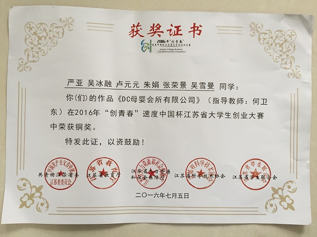 近日,开云官网团委从2016年“创青春”江苏省大学生创业大赛组委会秘书处获知喜讯:开云官网两件作品荣获2016年“创青春”江苏省大学生创业大赛铜奖。今日,正式收到获奖证书。