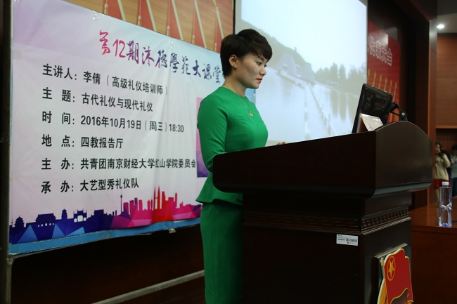10月19日18时30分,由开云官网团委主办,大学生艺术团型秀礼仪队承办的第十二期“沐德学苑大课堂”之“古代礼仪与现代礼仪”专题讲座在四教报告厅成功举办,特邀高级礼仪培训师李倩老师为主讲人。