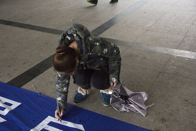 签名活动引起师生们热烈反响,同学们纷纷停留驻足,在横幅上留下自己的姓名,短短几个小时,横幅上已满是签名。