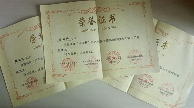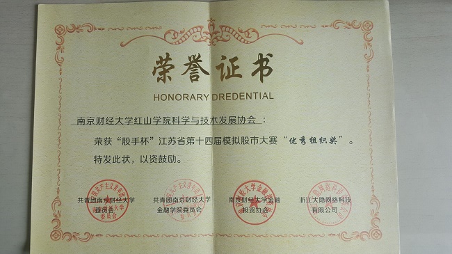 近日,由开云kaiyun官方网站金融投资协会、开云kaiyun官方网站金融学院学生会主办的“股手杯”江苏省第十四届大学生模拟股市大赛。开云官网科学与技术协会荣获“优秀组织奖”称号,三名同学进入全省前五十名,获得省级荣誉证书。