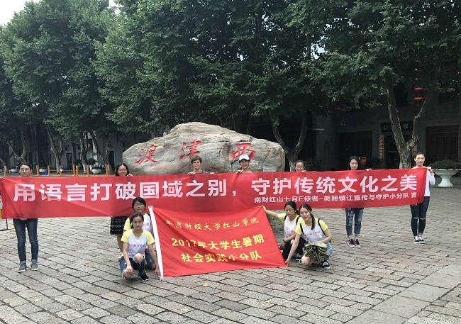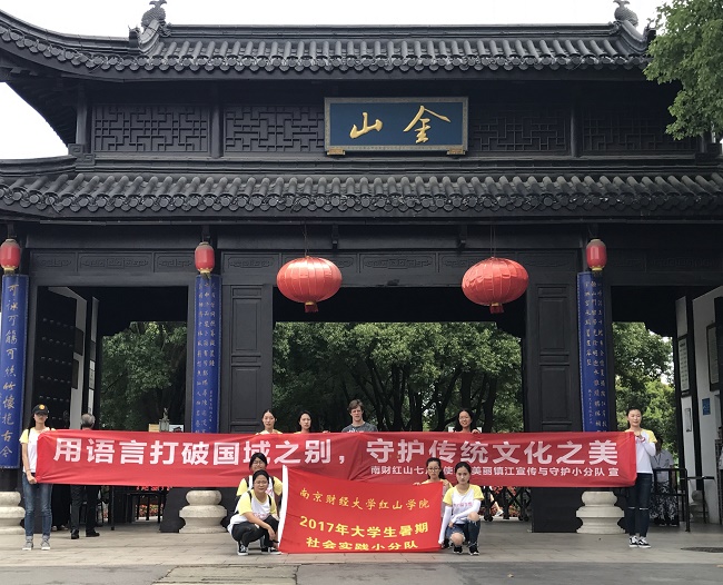 随后,小分队来到了著名历史文化古建筑址地——镇江西津渡,开始第二站的英文导游与保护古建筑的志愿者活动。镇江西津渡位于镇江城西的云台山麓,是依附于破山栈道而建的一处历史遗迹。西津渡古街是镇江文物古迹保存最多、最集中、最完好的地区,是镇江历史文化名城的“文脉”所在。这里共有文物保护单位 12 处,其中国家级文物保护单位 1 处,省级文物保护单位 2 处,处处体现中华文化的源远流长、博大精深,对历史文化古迹的珍藏和重视。
