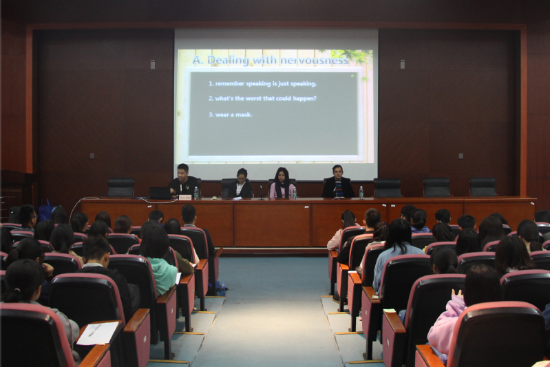 交流会初始,主讲人Jerry Zhao从就怎样克服交流紧张感、如何介绍别人、如何应对英语口语测试和OTE等四个方面与同学们进行了交流,并向同学们传授了一些如何说好英语的小技巧,分享他学习英语的经验和趣事。随后,在最后的问答环节,同学们结合自身在学习英语中遇到的问题,一一向嘉宾提出,在一问一答的交流中,现场气氛十分活跃。