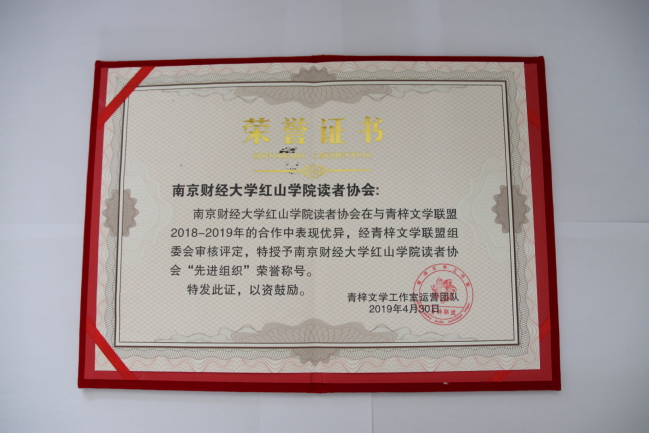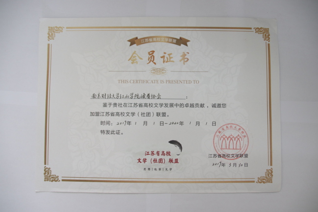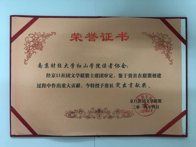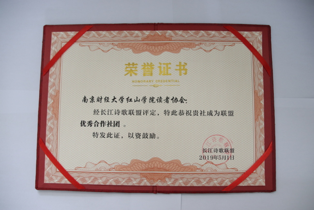 在2018-2019学年中,开云官网读者协会社团作为江苏省高校文学联盟会员,本学年工作卓越,对外交流工作突出,在各类省级征文、诗词比赛中表现优异,荣获京口文学联盟“突出贡献奖”、青梓文学联盟“先进组织”、长江诗歌联盟“优秀合作社团”、南边文化艺术馆“银牌组稿组织奖”、渌水诗社“优秀学术组织”、句容市作协“突出贡献奖和优秀组织奖”等多项荣誉。