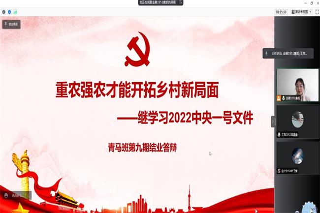 经过两周的准备,两校区共50名学员对结业论文展开答辩。答辩过程中,学员们主要从党史学习、文化自信、疫情防控、组织创新、革命影视作品等多个方面展开,他们以认真的调研态度、扎实的工作作风展现了青年马克思主义者的青春风采。现场提问环节,学员们对自身论文内容展开针对性阐释,展现了独特的风采与实力。本次答辩会为学员们提供了交流学习的机会与平台,进一步检验了“青马班”学员理论与实践的学习成果,使学员们对一年来在青马班的学习有了更好的梳理和内化。