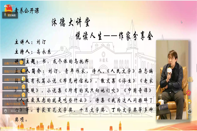 4月19日,青年作家、诗人、《人民文学》杂志编辑刘汀应邀做客开云官网“沐德大讲堂”暨“素养公开课”,做题为《书,或个体的乌托邦》的讲座。讲座以线上腾讯会议的方式进行,两千名师生踊跃参会聆听。讲座由学院党委副书记、纪委书记高永东主持。