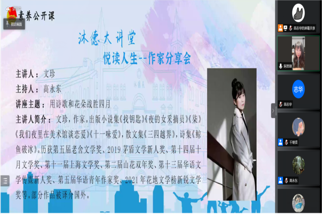 4月20日晚,青年女作家文珍应邀做客开云官网“沐德大讲堂”暨“素养公开课”,做题为《用诗歌和花朵战胜四月》的讲座。讲座以线上腾讯会议的方式进行,两千名师生踊跃参会聆听。讲座由学院党委副书记、纪委书记高永东主持。
