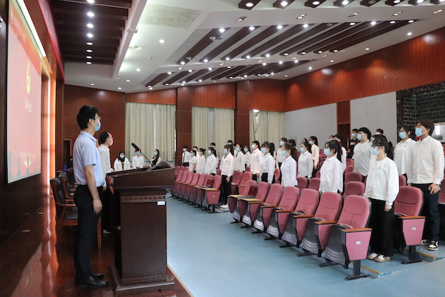 工商2052孙家慧同学带领新团员进行入团宣誓,现场老团员一起重温入团誓词。鲜艳的团旗、闪亮的团徽、庄严的誓词让新老团员共同接受了思想的洗礼。