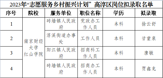 为进一步聚焦乡村振兴项目,激发广大青年和大学生志愿者为乡村发展贡献青春力量,根据《关于实施2022年江苏大学生志愿服务乡村振兴计划的意见》(团苏委联〔2022〕5号)文件精神,院团委与南京市高淳区设立“校地对接定向志愿服务岗”。经过个人申报、系团总支推荐,院团委审核和地方面试后,拟录取徐云舒等4位同学为“大学生志愿服务乡村振兴计划”高淳区校地对接志愿者,拟录取名单如下: