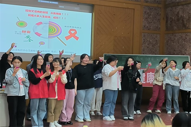 刘晓霞科长分别从艾滋病流行趋势、艾滋病基础知识、艾滋病感染风险、合成毒品的传播及危害、艾滋病预防等五个方面展开讲座。专业知识讲解后,刘晓霞科长与现场观众展开互动,同学们踊跃举手回答问题,现场氛围活跃。实践操作环节,刘晓霞科长准备了24杯“水”,24位观众上台参与,同学们分为4组交换手中的“水”,第一次每组同学组内交换,每组各一名同学出列,剩下的同学和相邻组交换,随后再和对面组交换。最终,志愿者帮忙倒入检测试剂,除一开始出列的同学外,其他同学的“水”全部变色。实验旨在揭示艾滋传播的可能性。