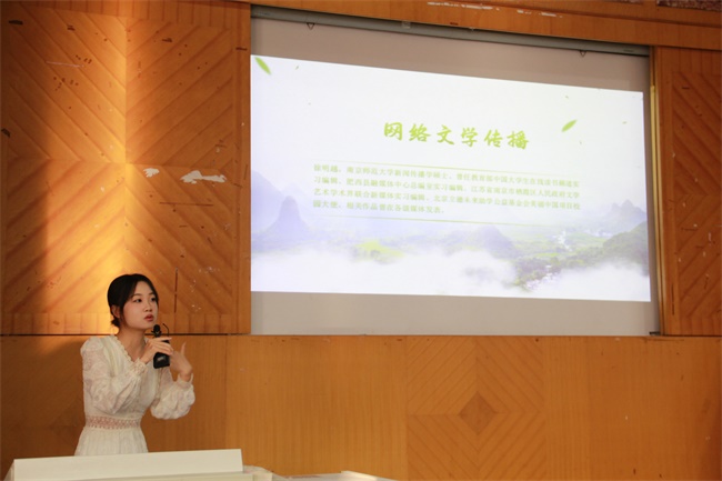 讲座伊始,雨魔老师以“网络文学知多少”这一主题为切入点,从网络文学大概、网络文学机会、网络文学特点和网络文学职业规划这五个方面进行详细讲解。雨魔老师通过对文学作品的通篇解读为例,深入讲解了网络文学的特点与优势,向同学们展示了网络文学的千秋之处。南京师范大学新闻传播学硕士徐明越同学通过举大量实例对网络文学作品创作的优势与产业现状进行阐述,并鼓励同学们积极进行网络文学创作。