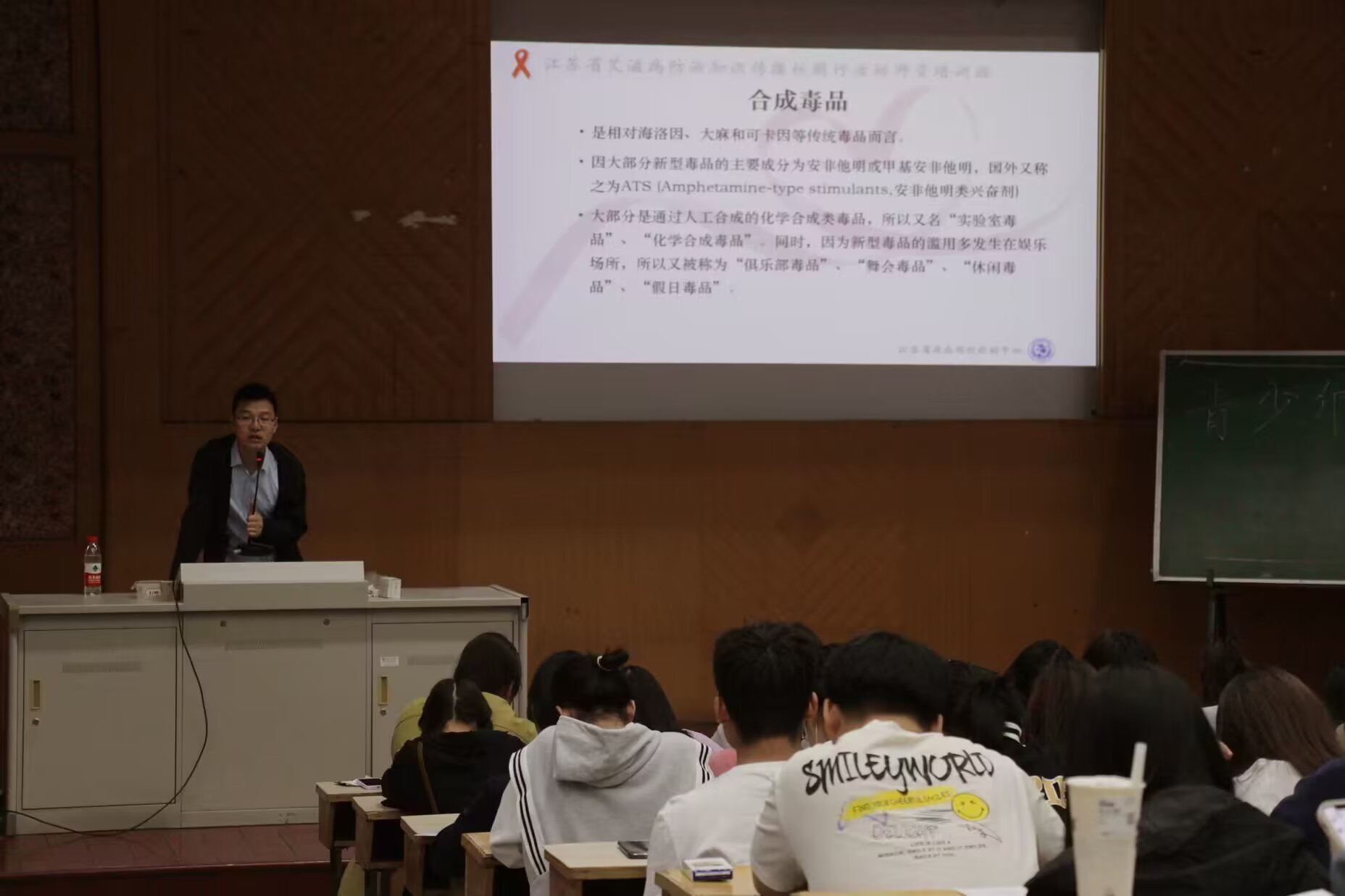 千继贤书记向学生展示最新艾滋感染数据及其在全国分布比例等,以详实的数据展现艾滋病近些年的蔓延趋势。随后,他向在场学生讲解艾滋病的基础知识,并分析青年学生感染艾滋病高危风险的因素。千继贤书记从青年吸毒现象切入,通过数据展示近几年青少年吸毒人数及感染艾滋病几率之间的联系,他呼吁青年学生珍爱生命,远离毒品。在艾滋病预防方面,千继贤书记还向学生介绍多种艾滋病预防措施,以此增加学生艾滋病预防知识,鼓励学生正确看待艾滋病,更好地践行健康的生活方式。
