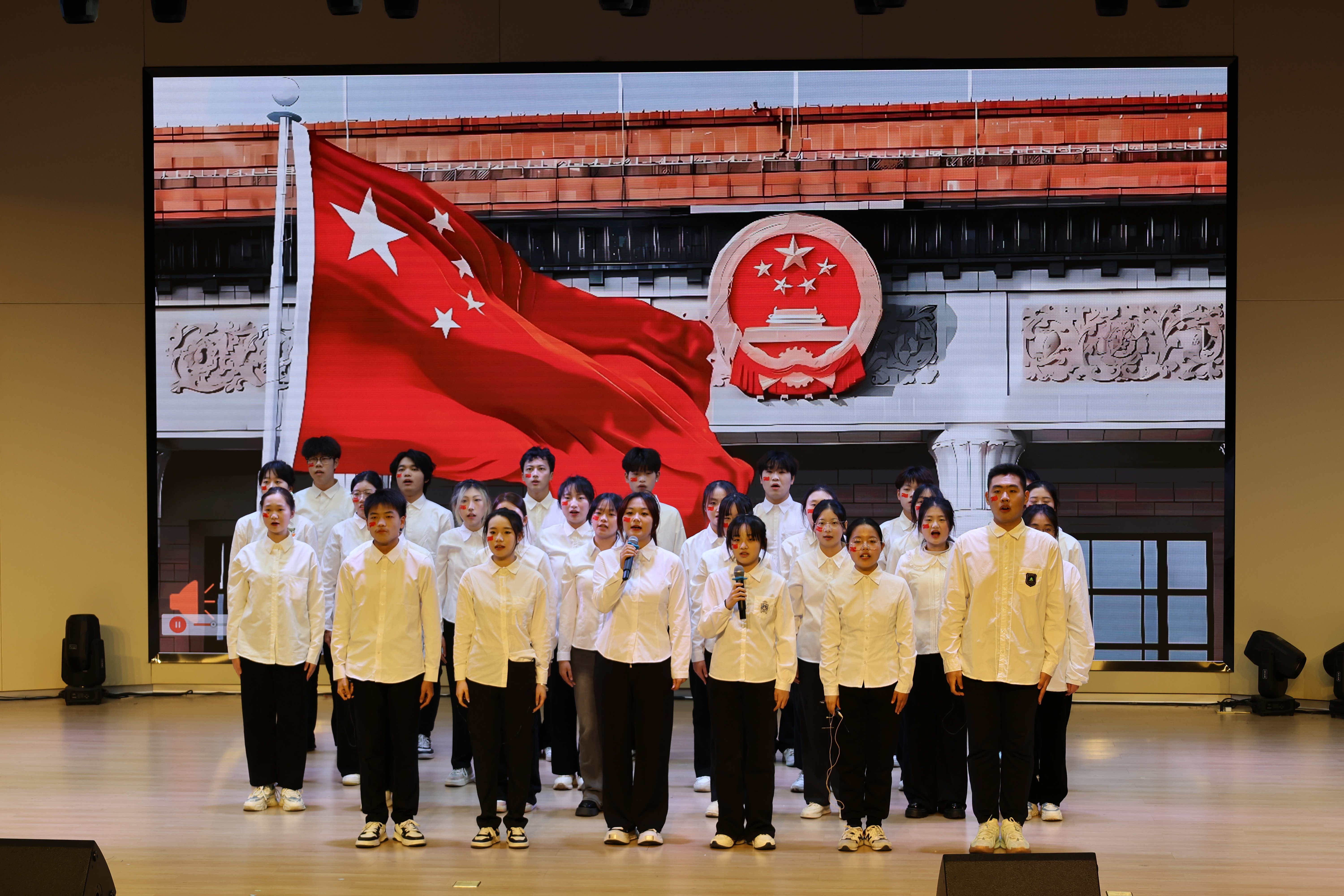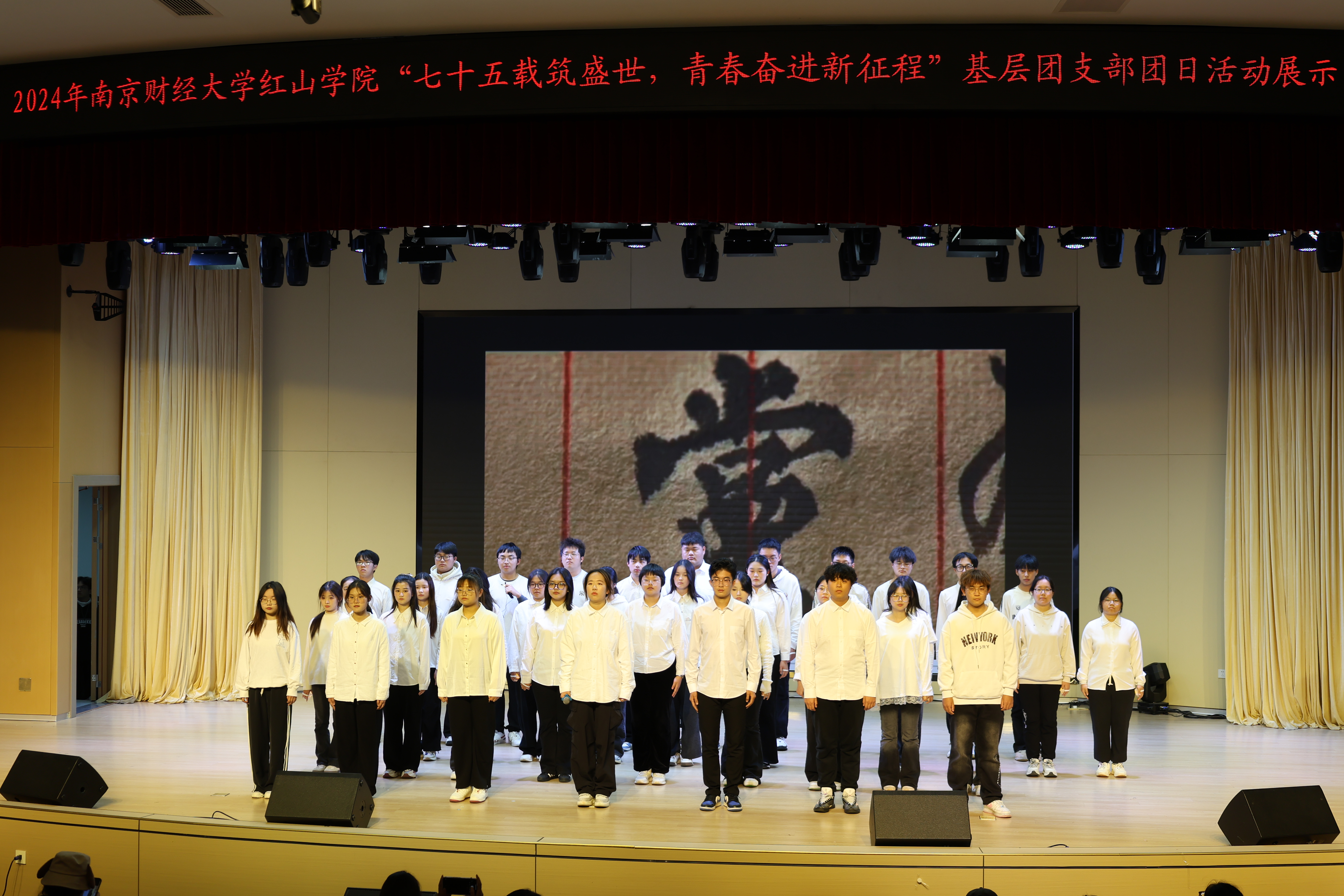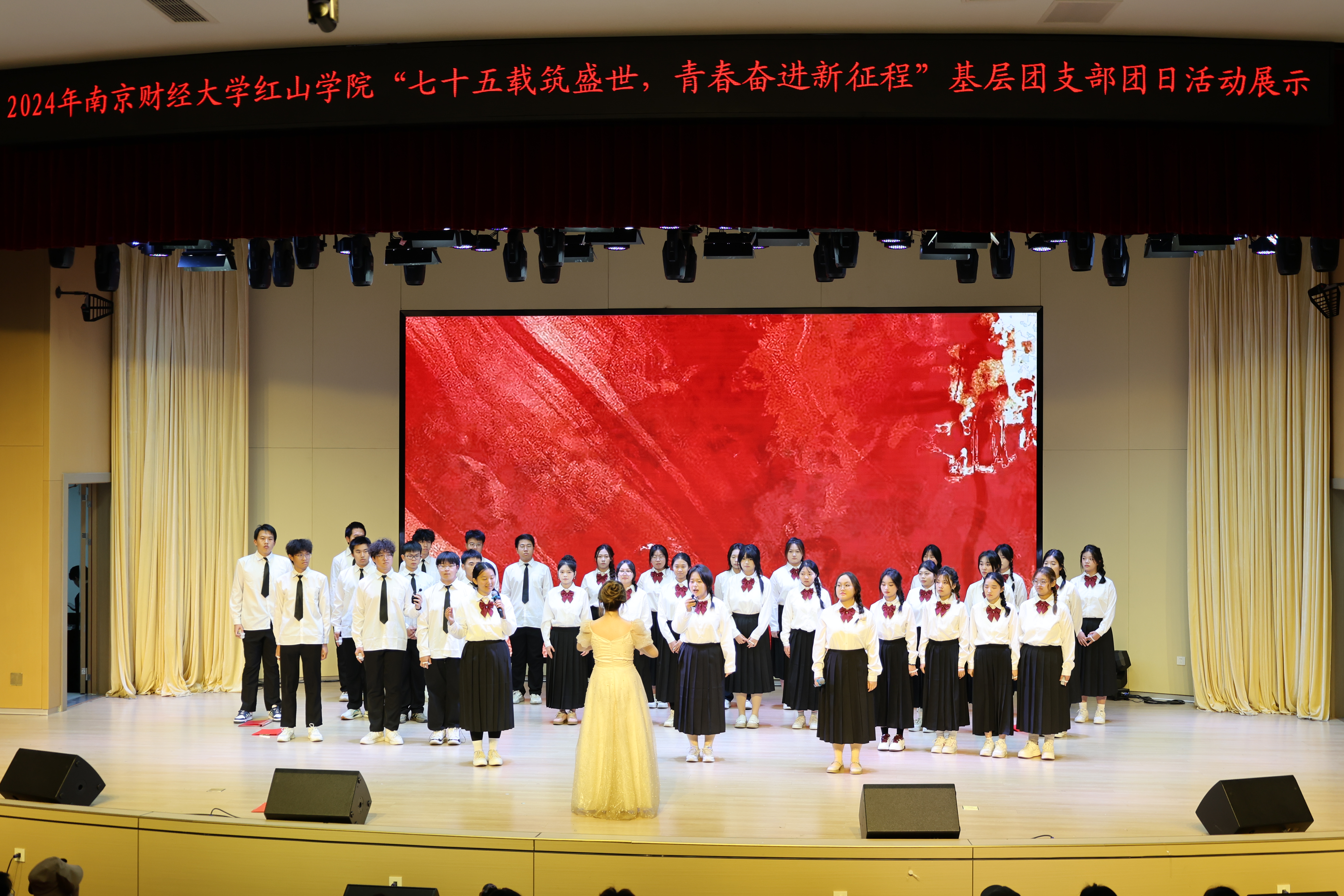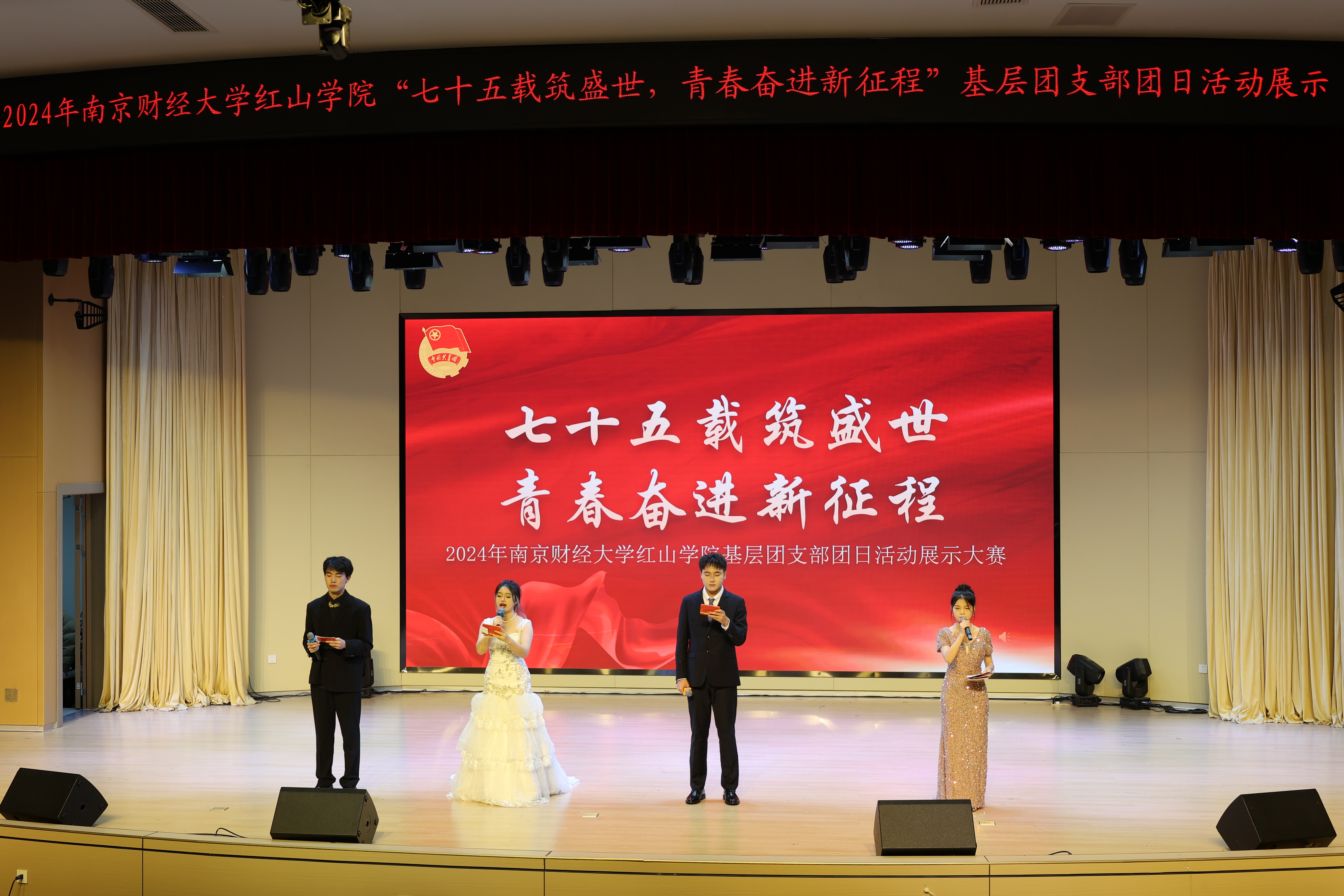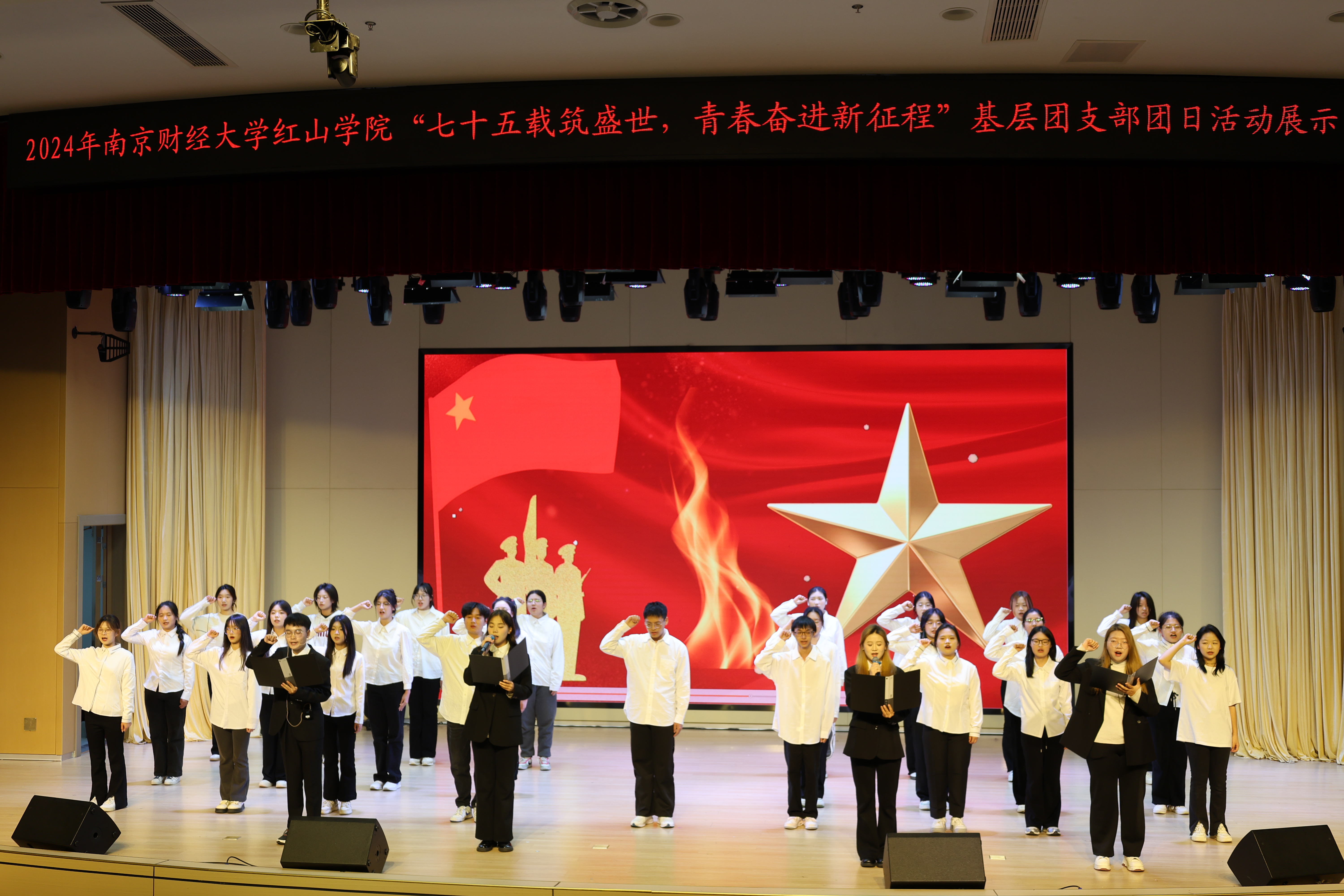 展示大赛在国贸2452团支部情景剧《七十五载奋斗之光 三下乡续振兴之章》中拉开序幕。工商2453团支部合唱《国家》,让观众感受到祖国的伟大,收获不断前进的勇气与力量。税收2451团支部带来情景剧《信仰之光》,从税务人的角度出发,讲述红色财经文化故事。会计2451团支部朗诵《山河赋色 红旗飘扬》,誓言回响,力量激荡。英语2453团支部情景剧《跨越时空的对话》立足当下,回望高考,带领师生体会“知识就是力量”。