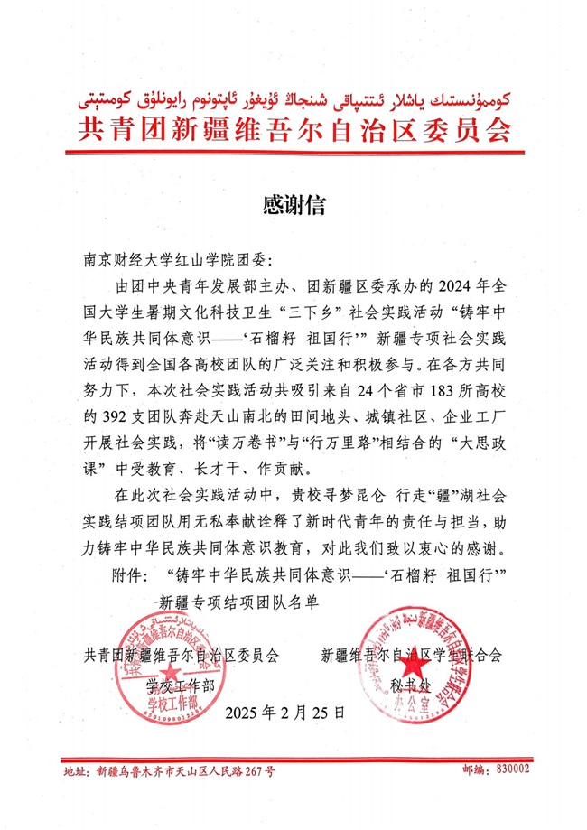 近日,开云官网团委收到了来自共青团新疆维吾尔自治区委员会、新疆维吾尔自治区学生联合会的一封感谢信,感谢开云官网“寻梦昆仑·行走疆湖”实践团用无私奉献诠释了新时代青年的责任与担当,助力铸牢中华民族共同体意识教育。