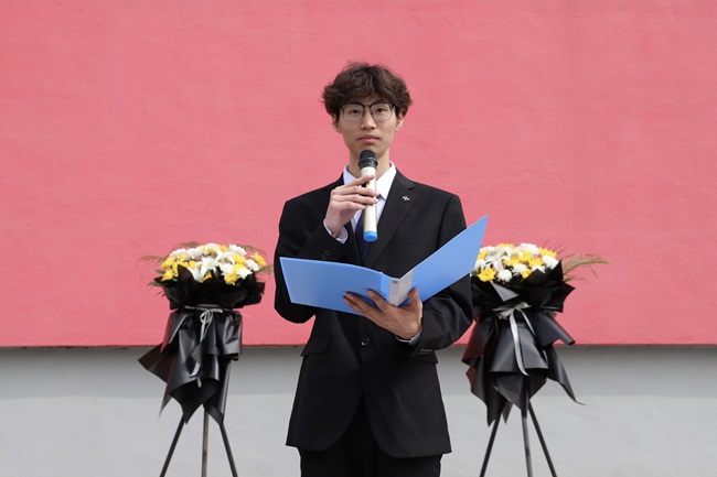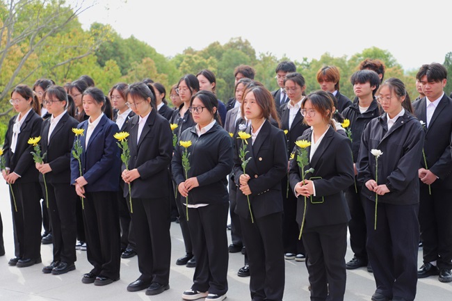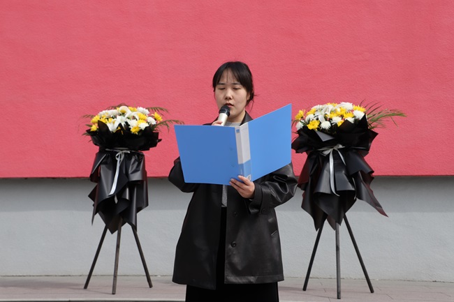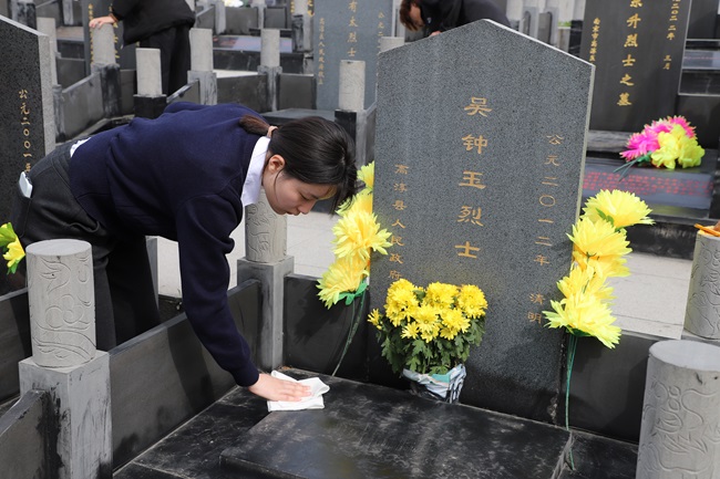 在纪念碑前,青年师生庄严肃立,行鞠躬礼,默哀、致敬。默哀毕,教师代表许艺蓝、学生代表朱佳乐代表师生发言,他们表示,烈士们以生命践行忠诚,在民族精神长河中立下不朽丰碑。当下,青年一代重任在肩,应铭记历史、砥砺前行。全体师生瞻仰纪念碑并依次敬献鲜花,表达对烈士的敬意与追思。随后,青年师生来到各烈士碑前,深深鞠躬并为烈士擦拭墓碑,表达崇高敬意与深切缅怀。
