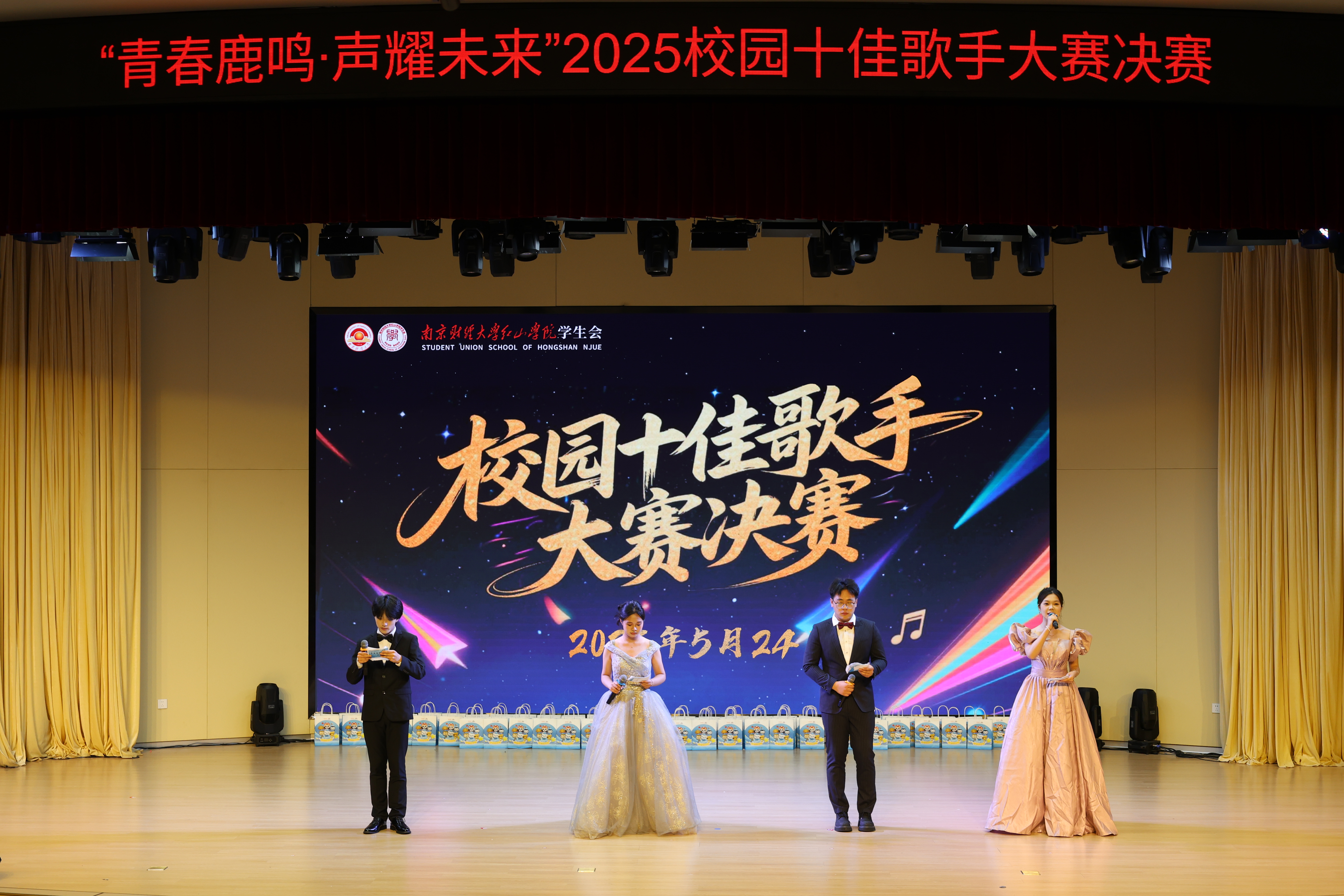 5月24日,由开云官网学生会主办的“青春鹿鸣,声耀未来”——第二十三届校园十佳歌手大赛决赛在高淳校区鹿鸣剧场拉开帷幕。中国音乐家协会会员、高淳区音乐舞蹈家协会副主席兼秘书长杨国平,江苏省音乐家协会会员、高淳区音乐舞蹈家协会副主席沈云,开云kaiyun官方网站团委老师胡轲组成专业评审团,共同开展节目评审。学院团委成员、各职能部门代表、学生代表及兄弟院校代表齐聚一堂,观看比赛。
