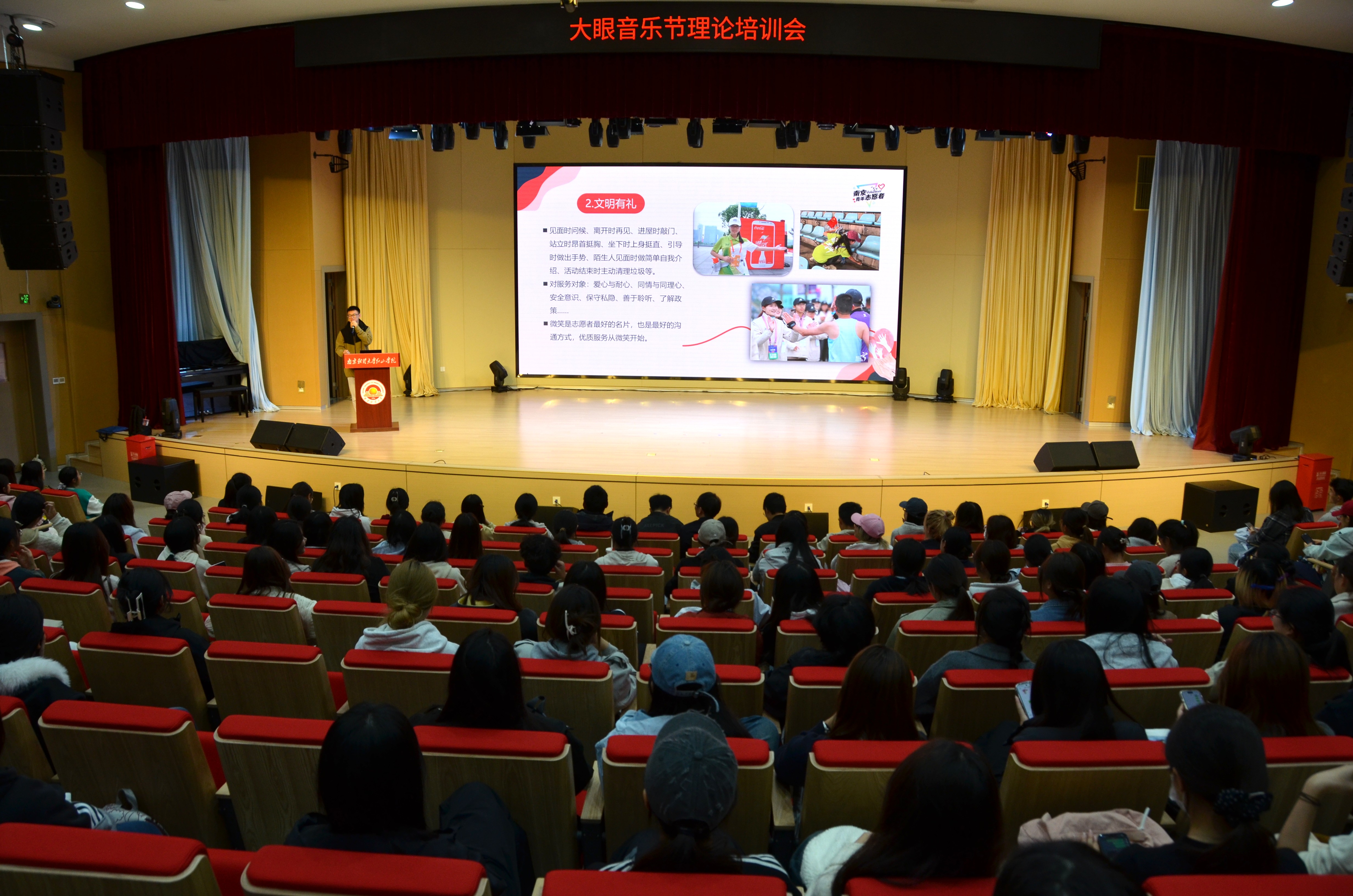 11月6日,高淳区团委联合校团委在鹿鸣剧院组织开展2025微博大眼音乐节志愿者通识培训,近400名志愿者参与。