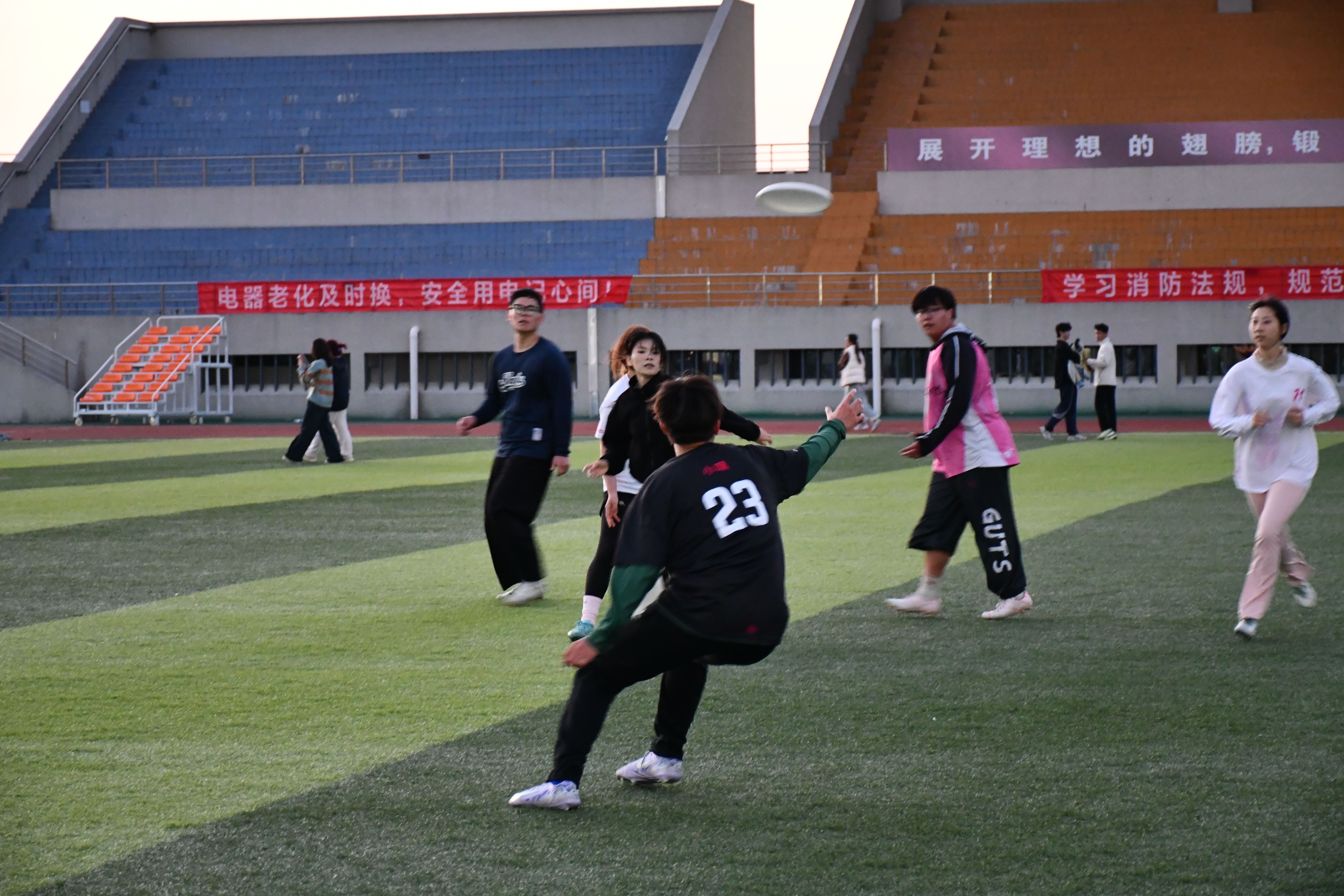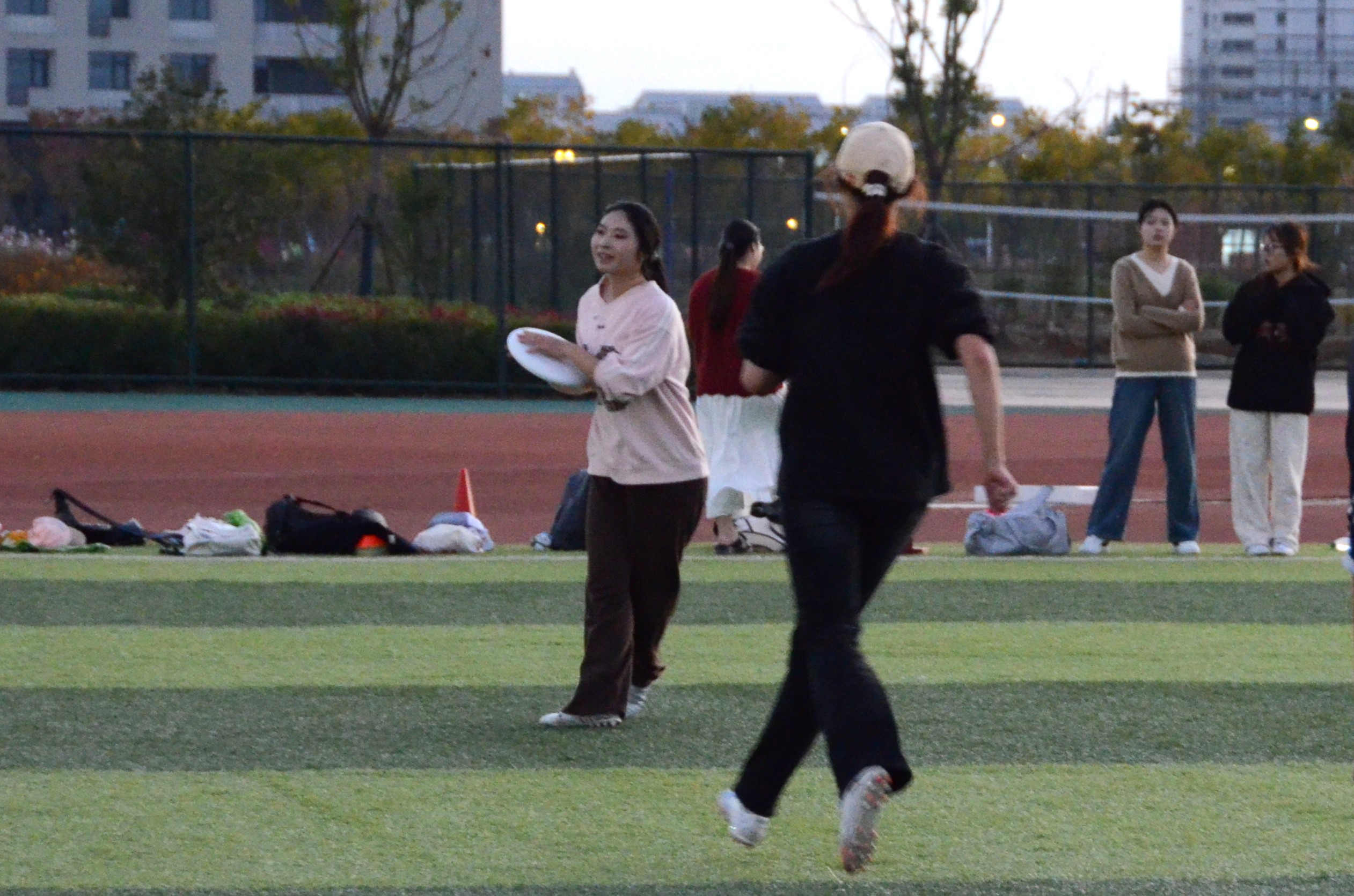 比赛采用“7v7”对抗形式,于操场两侧同时开赛。赛前,负责人为参赛选手讲解比赛规则,选手们充分热身完毕后,比赛正式拉开帷幕。赛场上,队员们奔跑、传接、飞扑,白色的飞盘在空中划出一道道优美的弧线,展现出较高的身体素质、精准的飞盘技术和快速的攻防转换,赢得场边观众的阵阵掌声。