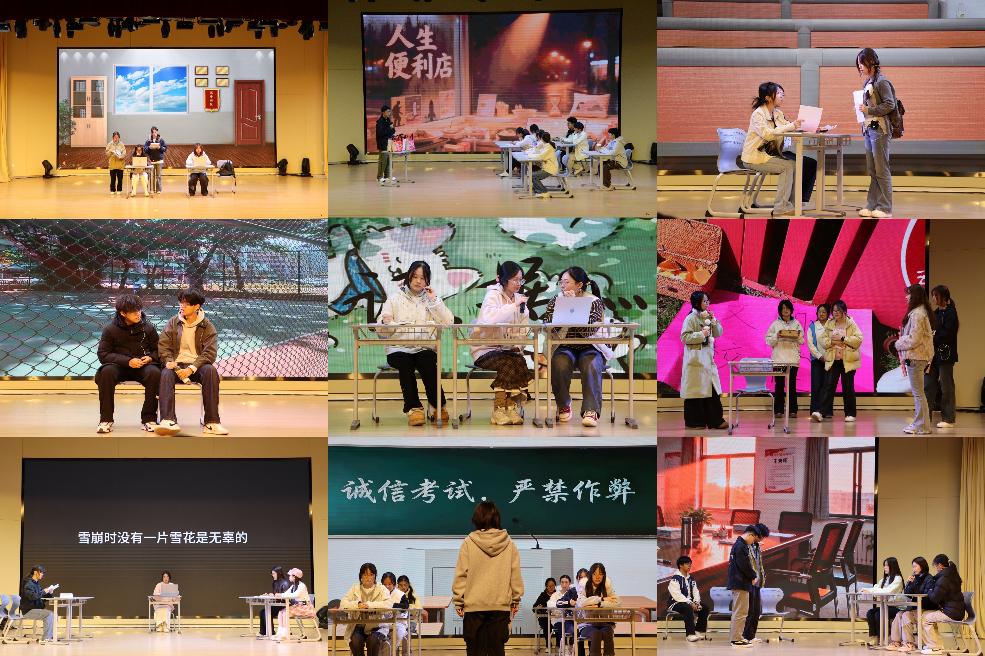 决赛现场精彩纷呈。金融2551班《道德绑架如何消解善意边界》深刻探讨善意与义务的边界,鼓励大家坚守初心;人资2553班《“热搜”审判日》引发观众对网络热搜的理性思考;审计2553班《一箱牛奶》用平凡物品承载深刻道德内涵,温暖人心;保险2551班《人生便利店》讲述诱惑与真诚、捷径与坚守的选择故事;财管2553班《屋檐下的阳光》展现出困境中的人间温情;会计2553班和物流2553班分别演绎《青春不“货”价》和《青春无“货”价》,共同警示同学们远离校园贷;法学2552班《文明直播间的美德盲盒》倡导网络空间的文明互动;商务2552班《朋友圈的真相》引导观众思考虚拟社交中的虚实与坚守。