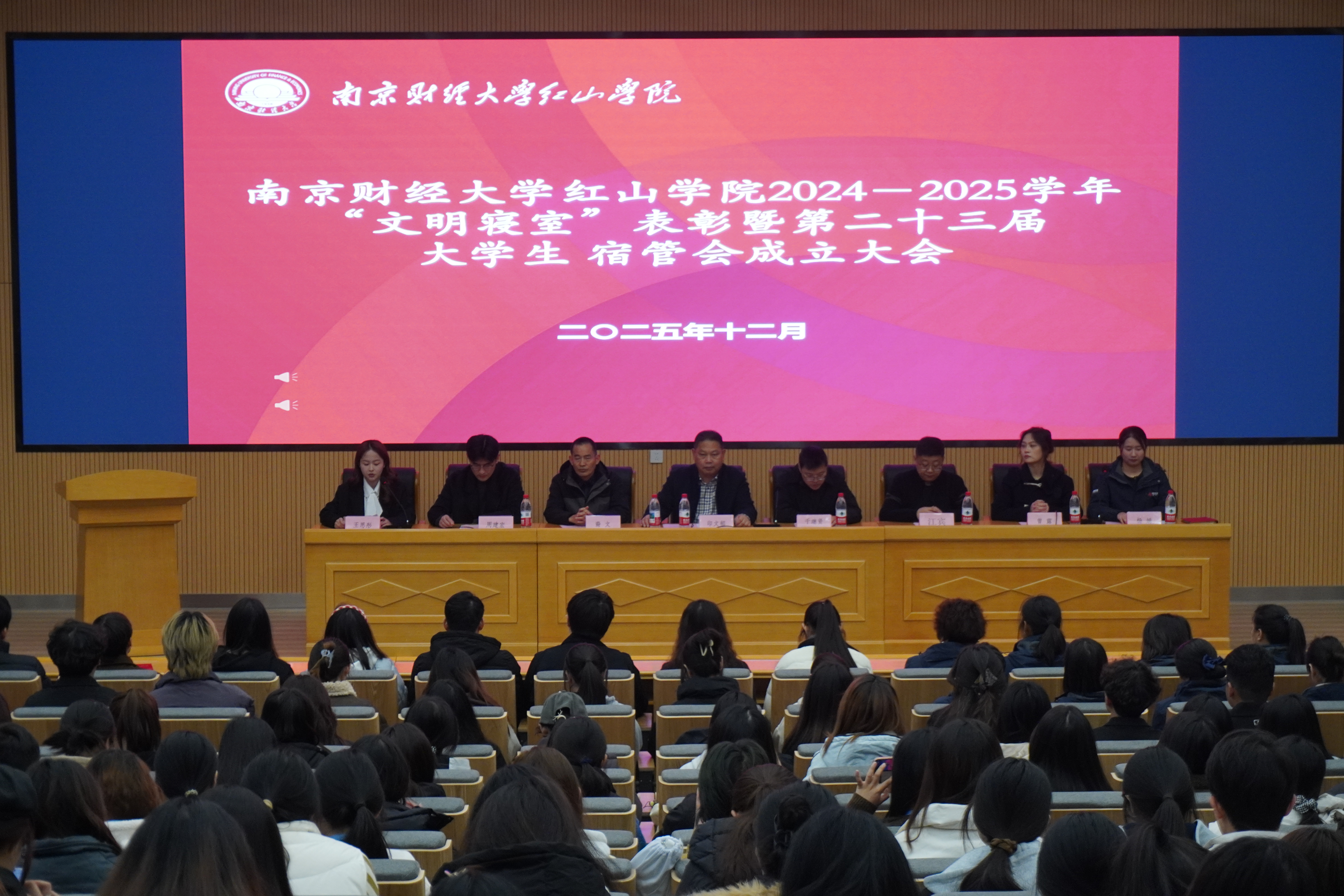 12月2日,学生社区管理与服务中心在公教楼第一报告厅召开2024-2025学年“文明寝室”表彰暨第二十三届大学生宿管会成立大会。党委学生工作部部长、学生处处长印文郁,后勤处副处长裔文,团委书记千继贤,学生社区管理与服务中心周建宏、曾露,保卫处江滨,南京银城有限责任公司红山项目经理杨娟,宿管会会长王思彤,辅导员老师代表、学生干部代表参加大会。