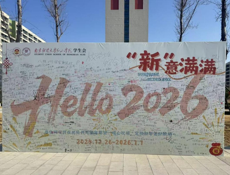 12月26日持续至1月1日,食堂广场前设立的“新年祝福墙”正式亮相,吸引了大量同学驻足,。大家纷纷提笔,写下对新一年的憧憬、对亲友的祝福或对学业生活的期许。一面祝福墙,成为了汇集同学们真诚情感与美好愿望的温暖角落,定格了新年伊始的欢乐瞬间。