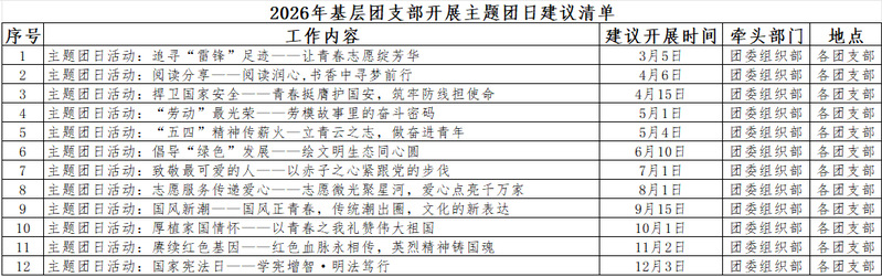 为进一步强化思想引领,筑牢青年信仰根基,激发基层团支部活力,切实提升团组织的引领力、组织力、服务力,夯实基层组织建设,现将2026年基层团组织主题团日活动指引通知如下: