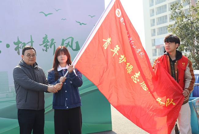 在热烈掌声中,院长李连军为“青年护绿志愿服务队”授旗。志愿者代表接过旗帜,也接过了守护绿色的责任与使命。这面旗帜不仅象征着荣誉,更将引领更多红山学子投身生态文明建设的洪流,成为守护校园绿色的生力军。