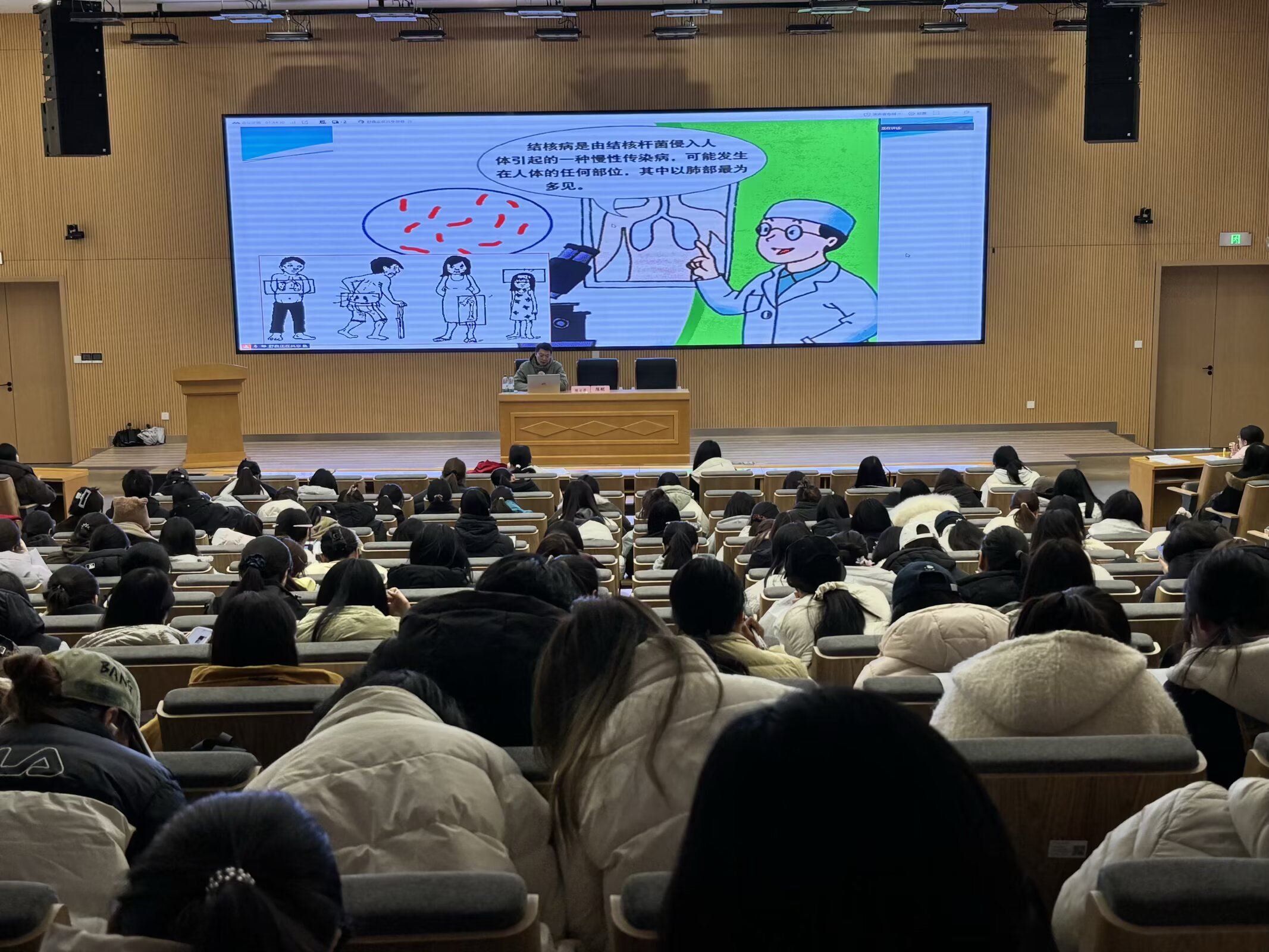 讲座中,陈云花医师结合校园传染病高打的特点和表现,围绕流感、水痘、诺如病毒传染等校园常见传染病展开专业讲解,清晰阐述传染病的传播途径、典型临床症状,精准区分传染病与普通感冒的核心差异。陈刚医师聚焦肺结核,从疾病认知、鉴别要点、传播方式到预防措施逐一细致讲解,让大家对结核病防控形成全面认识。两位医师均立足生活实际,普及科学有效的防控方法,重点强调勤洗手、规范佩戴口罩、常通风、不随地吐痰等日常防护习惯,引导同学们将健康理念融入生活细节。