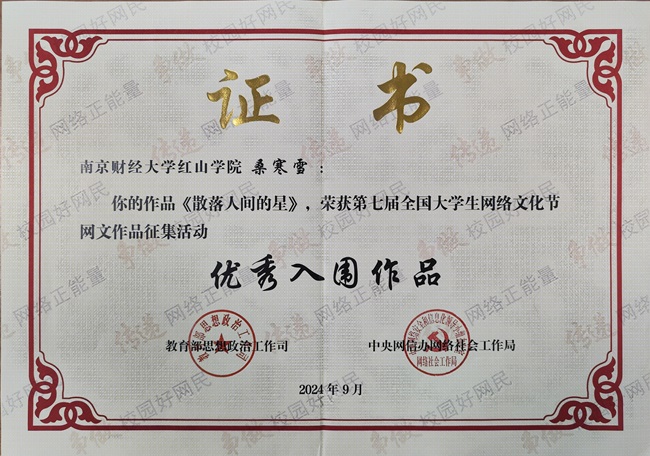 获奖作品证书近日,由教育部思想政治工作司、中央网信办网络社会工作局联合举办的第七届“全国大学生网络文...