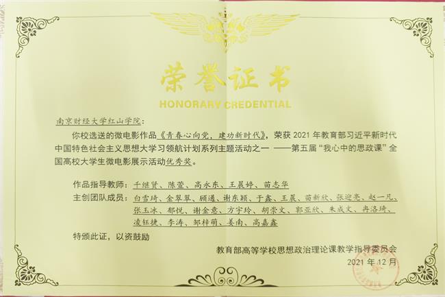 获奖证书近日,由教育部高校思政课教学指导委员会主办的“我心中的思政课”第五届全国高校大学生微电影展示...