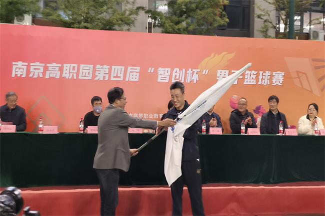 紧接着举行的会旗交接仪式将现场气氛推向高潮。在全体与会人员的见证下,红山学院杨军副院长与南京理工大学紫金学院校长助理徐春燕在主席台前完成“智创杯”赛旗交接。这标志着第五届“智创杯”男子篮球赛将在南京理工大学紫金学院举办,体现了南京高职园校际体育交流与合作精神的传承与发展。