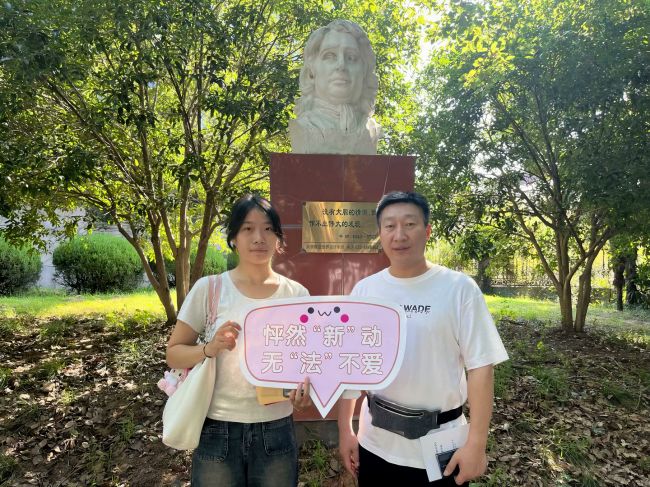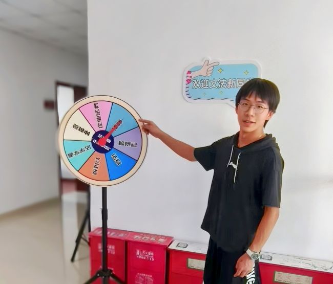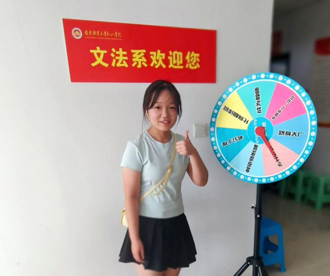 为展现多元文化特色,文法系精心布置了新生互动打卡区。志愿者们举着各式各样的标牌,热情欢迎新同学的到来,并邀请他们拍照打卡。其中,最亮眼的打卡处莫过于“未来的你”时空转盘。该转盘根据文法系法学专业和英语专业今后的发展方向和职业规划设计而成,旨在互动的欢乐过程中,让学生对所学专业有初步了解和对未来职业的展望。