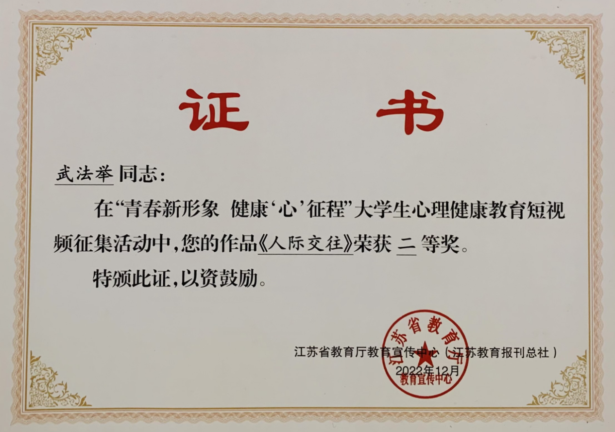 近日,江苏省教育厅教育宣传中心(江苏教育报刊总社)公布了“青春新形象,健康‘心’征程”大学生心理健康教育短视频征集活动获奖名单。其中,开云官网营销2253武法举同学拍摄的《人际交往》荣获二等奖。本次活动有效推动了我省大学生心理健康教育工作的发展,也进一步引导大学生树立自尊自信、理性和平、积极向上的良好形象,积极关注心理健康,争做时代好青年。