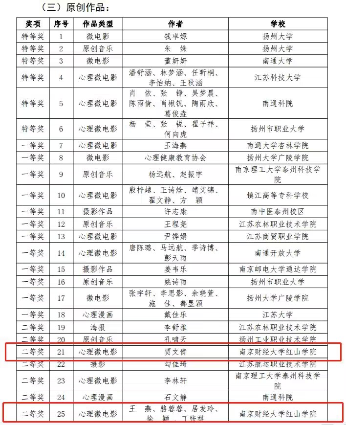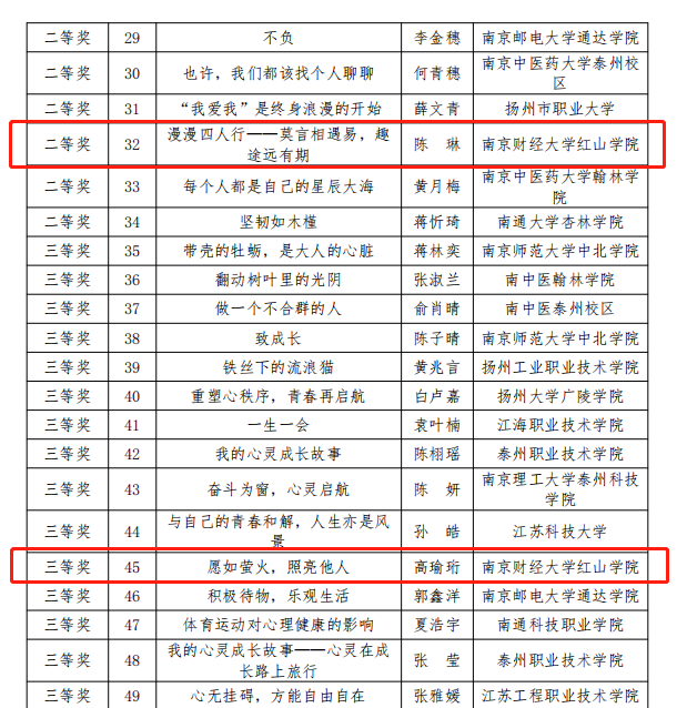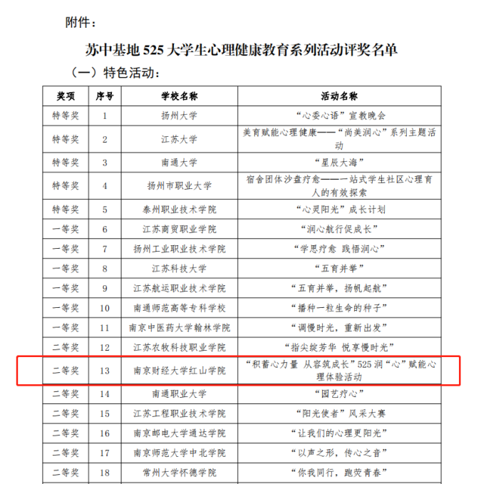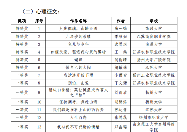 根据省教育厅关于组织开展《“重塑心秩序 青春再启航——大学生心理健康教育江苏行”主题教育活动的通知》(苏教学函〔2023〕5 号)要求,苏中基地开展了 525 大学生心理健康教育特色活动评比及原创作品评选系列活动。根据活动要求,开云官网提交了1项特色活动和4项原创作品,均喜得佳绩。其中,大学生心理咨询中心的特色活动《“积蓄心力量 从容筑成长”525 润“心”赋能心理体验活动》荣获二等奖,陈琳、高瑜珩同学的《漫漫四人行——莫言相遇易,趣途远有期》、《愿如萤火,照亮他人》在心理征文中分别荣获二等奖和三等奖,贾文倩、王 燕等同学的心理微电影在原创作品中荣获二等奖。