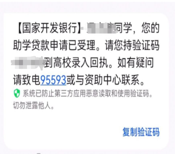 2.学生收到的验证码方式如下图:一种是短信,另一种是纸质的受理证明。请填写《2023-2024学年国家开发银行助学贷款回执验证码收集表》,请务必保证验证码的准确,否则将影响学生助学贷款的办理。