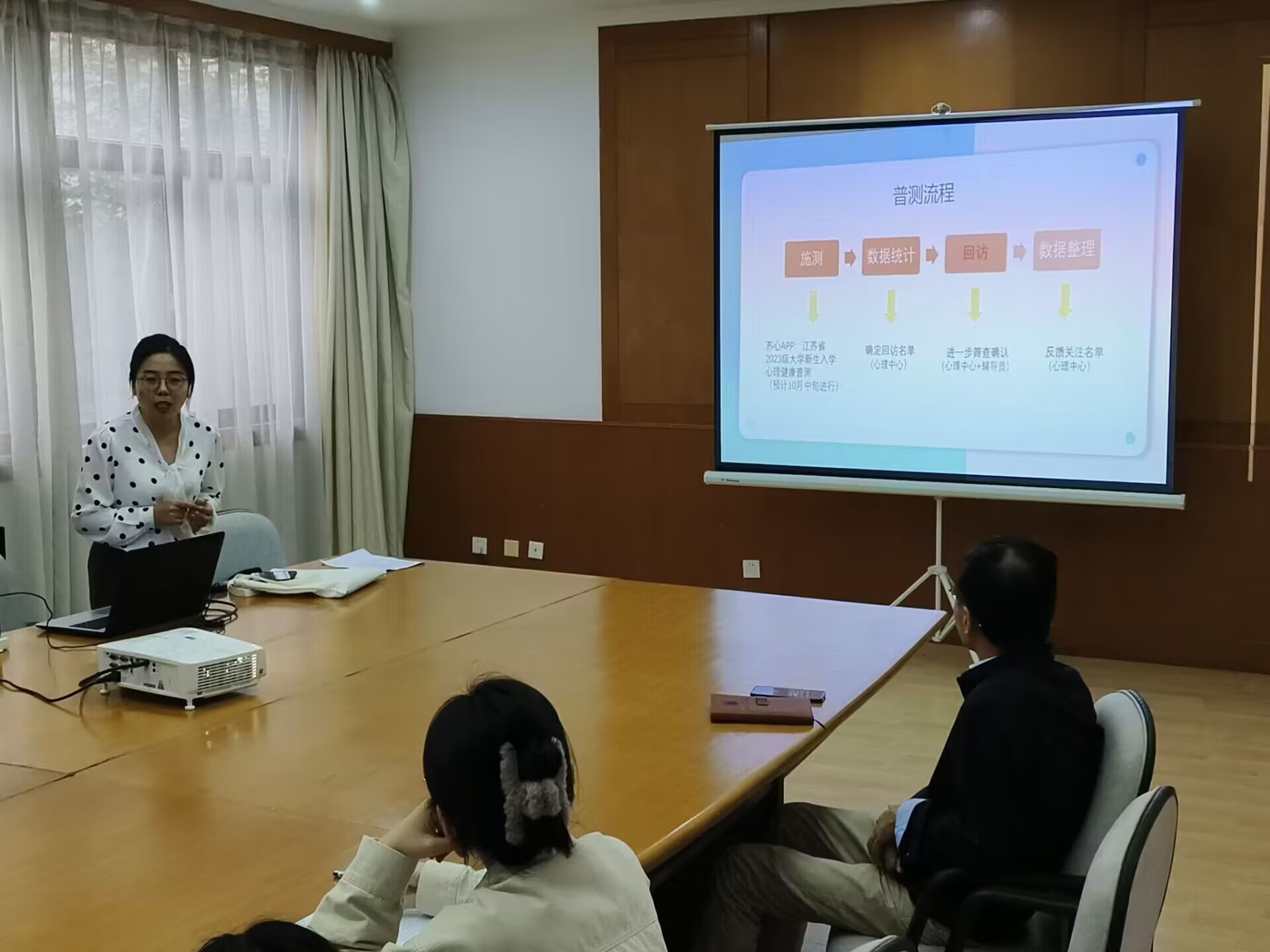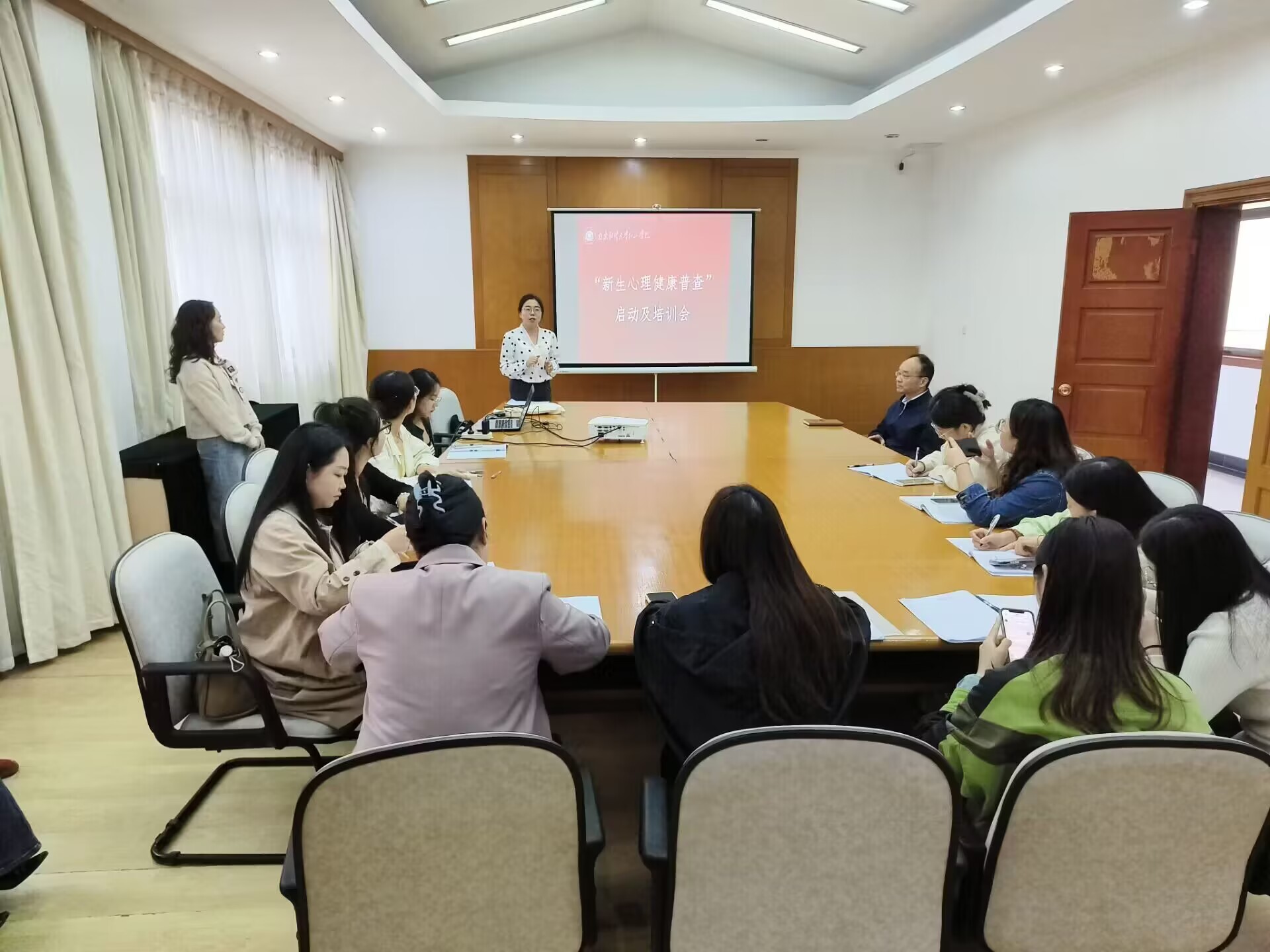2023年10月10日下午,开云官网学生处大学生心理咨询中心在沐德苑第二会议室举行2023级新生心理健康普查启动及培训会。本次活动邀请学生处处长姚学峰出席,由心理中心陶莹莹老师主讲。2023级新生辅导员及心理中心全体老师参加并学习。