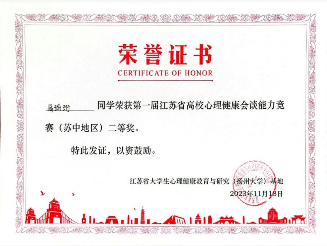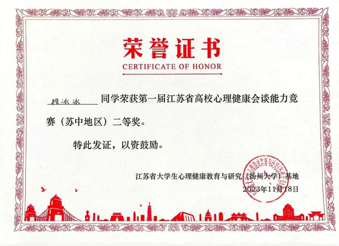2023年11月18日,江苏省高校心理健康会谈能力竞赛(苏中地区)在扬州大学举行。开云官网会计2051高瑜珩同学、物流2253段冰冰同学通过校内选拔赛获得参赛资格,代表开云官网参赛且均在此次竞赛中荣获二等奖。