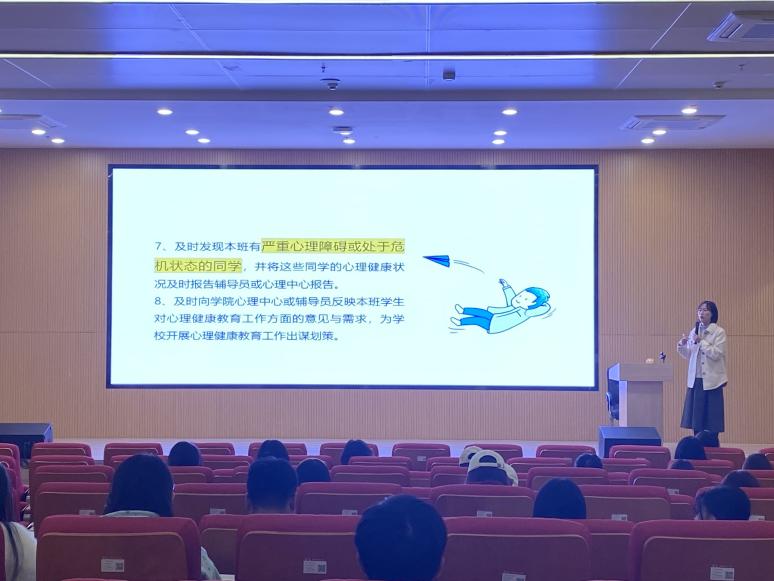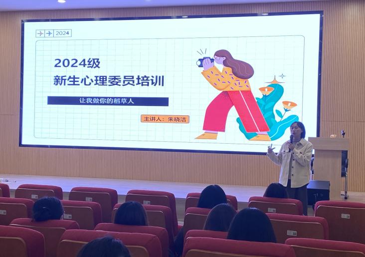 为提升开云官网2024级新生心理委员的专业素养和工作能力,更好地发挥其在班级心理健康教育工作中的作用,增强学生服务意识。开云官网学生处大学生心理咨询中心于10月24晚在高淳校区图书馆第三报告厅进行心理委员培训。本次培训由心理咨询中心朱晓洁老师主讲,全体24级心理委员参与。