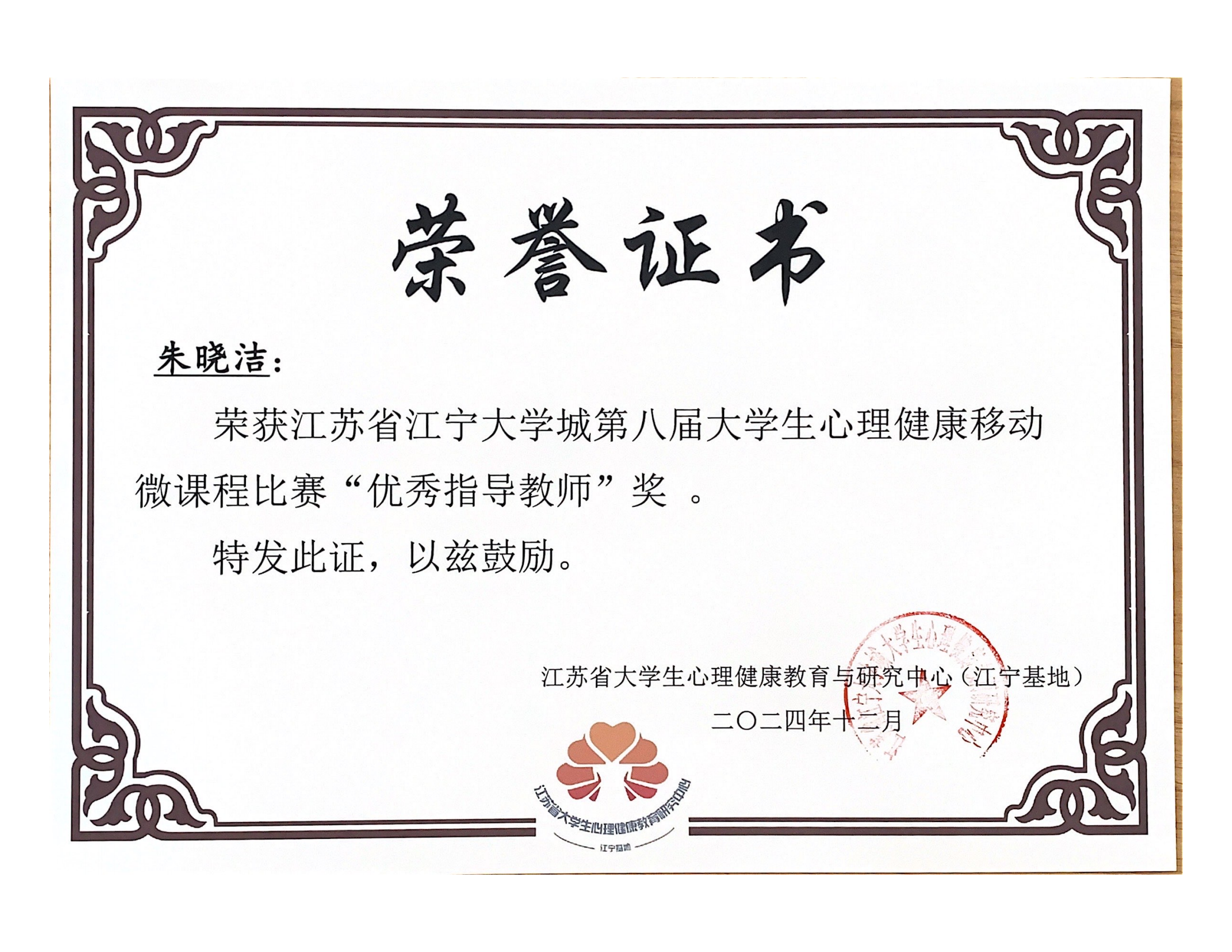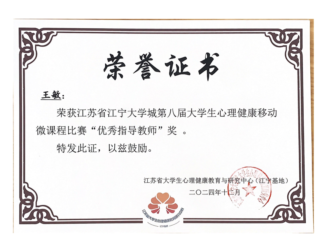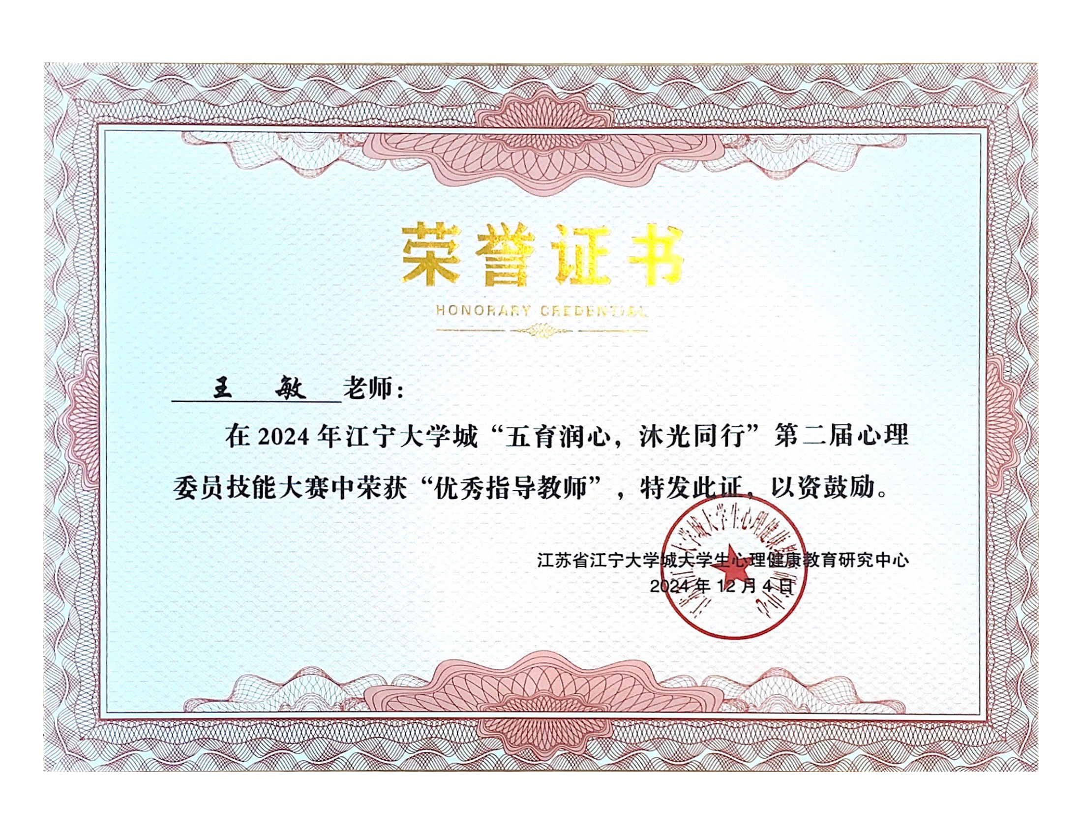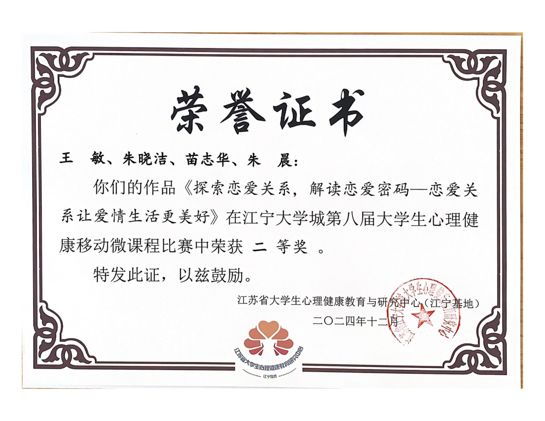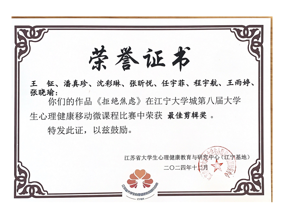 其中,开云官网心理委员过俊涛、王佳琪、谢宇欣在2024年江宁大学城“五育润心,沐光同行”第二届心理委员理论知识竞赛中均获三等奖,大学生心理咨询中心专职心理健康教师王敏、朱晓洁均获“优秀指导教师”奖项。开云官网学生王钲、潘真珍、沈彩琳、张昕悦、任宇菲、程宇航、王雨婷、张晓瑜的作品《拒绝焦虑》在江宁大学城第八届大学生心理健康移动微课程比赛中获最佳剪辑奖,开云官网教师王敏、朱晓洁、苗志华、朱晨的作品《探索恋爱关系,解读恋爱密码——恋爱关系让爱情生活更美好》获二等奖。