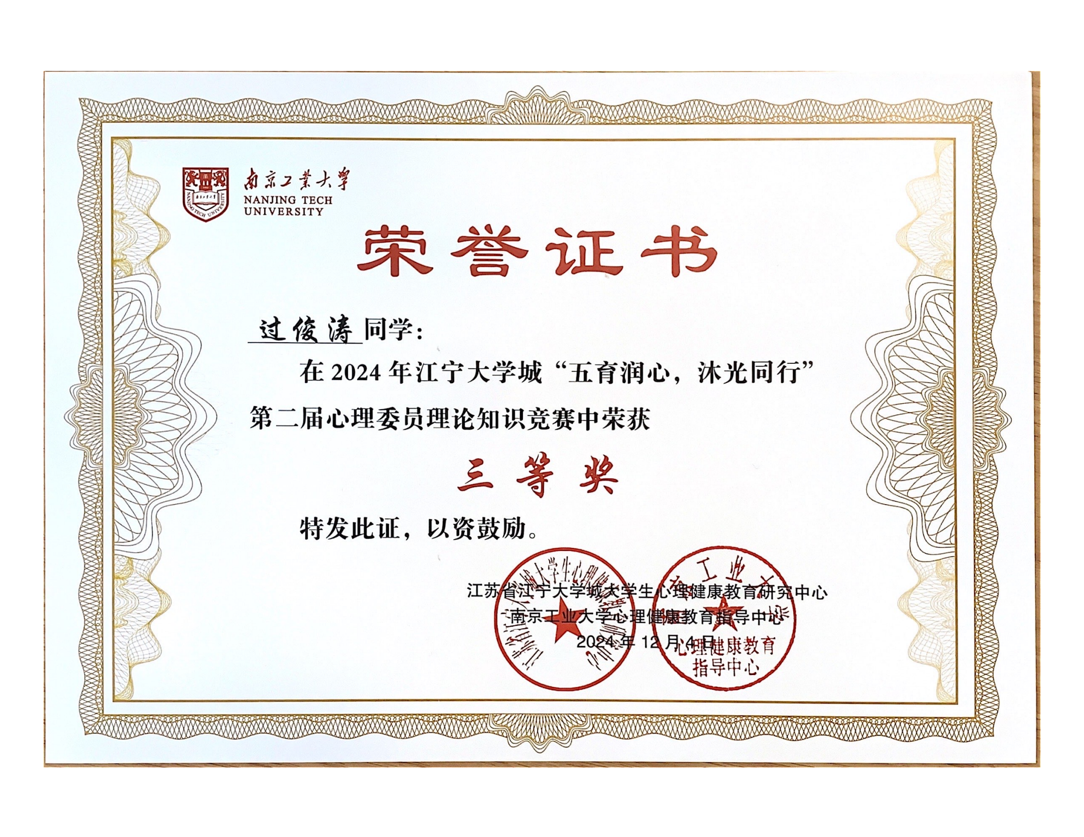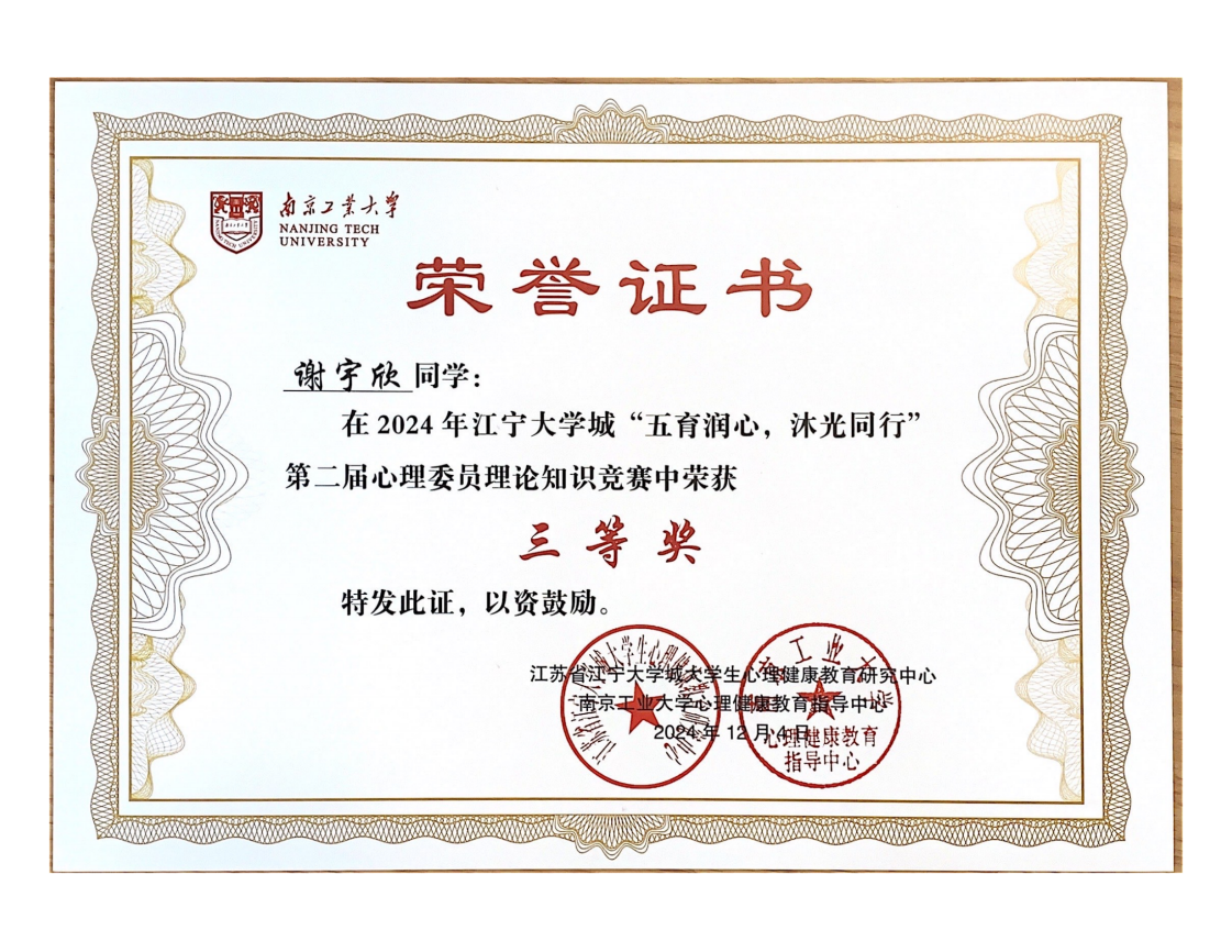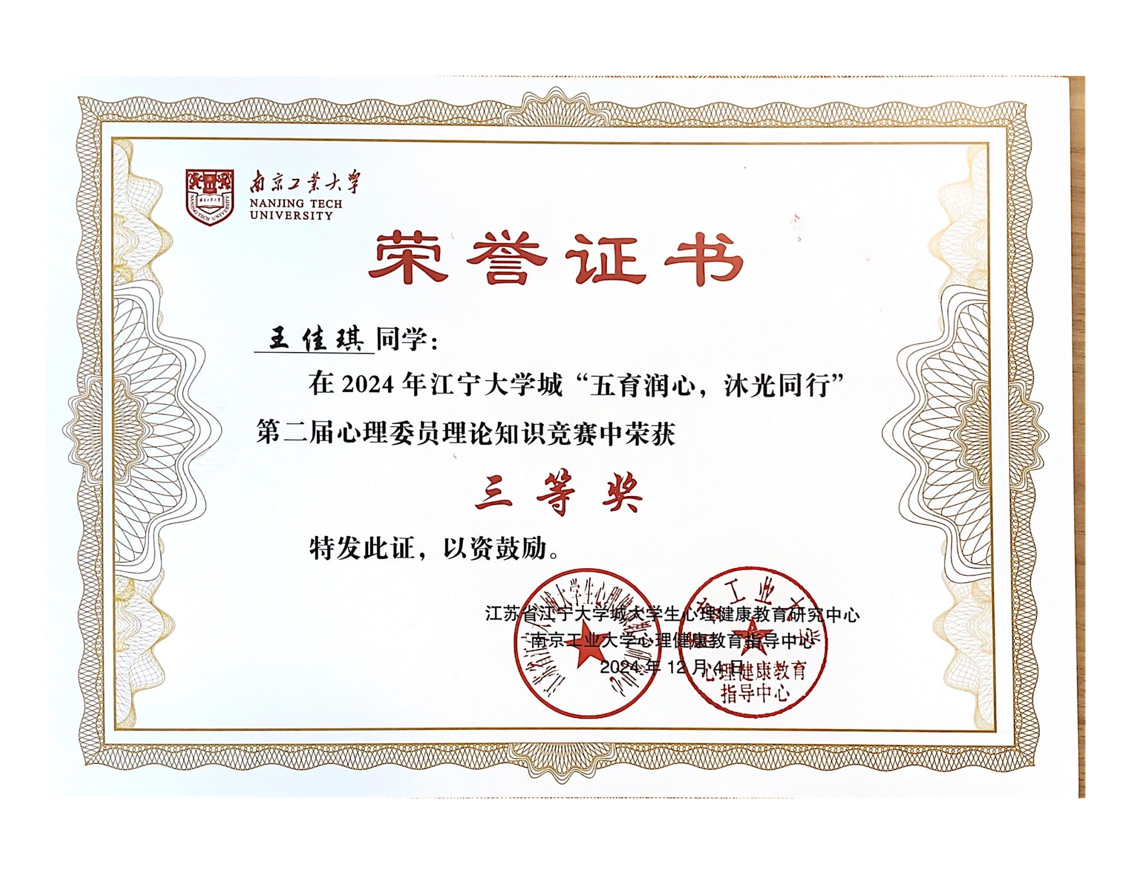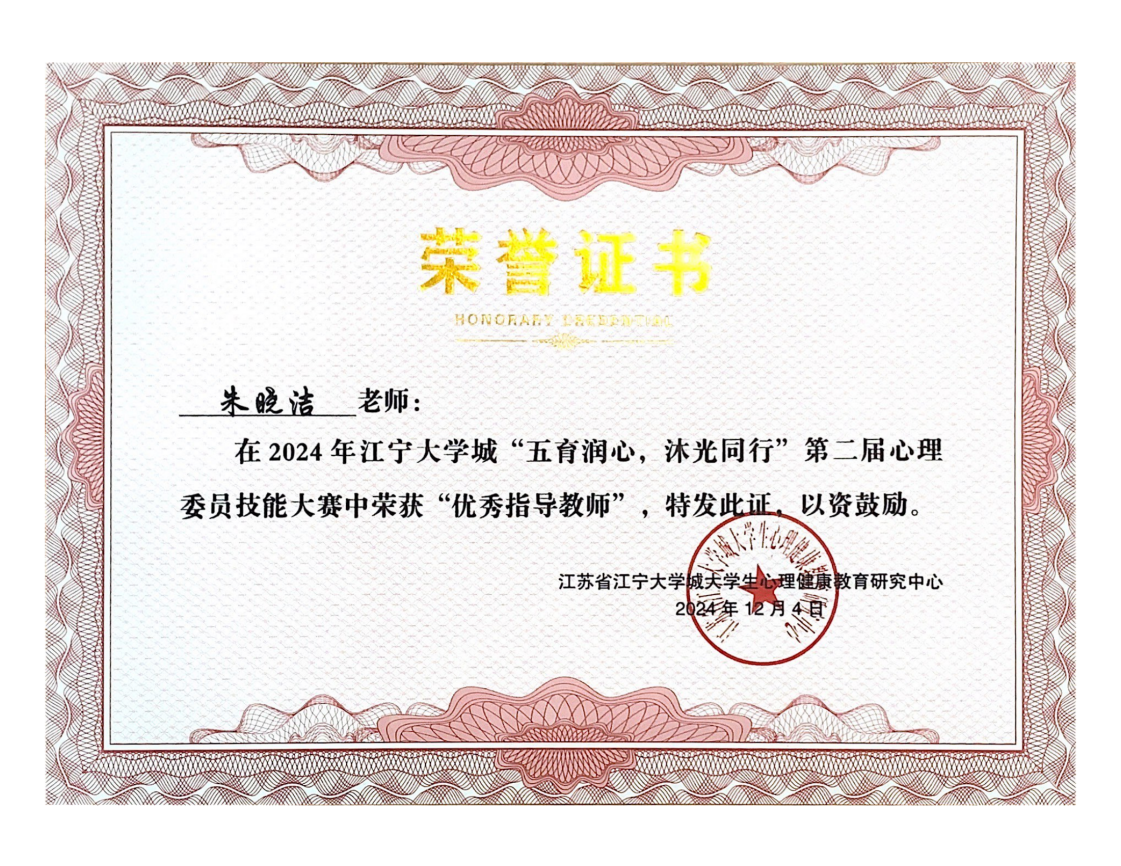 其中,开云官网心理委员过俊涛、王佳琪、谢宇欣在2024年江宁大学城“五育润心,沐光同行”第二届心理委员理论知识竞赛中均获三等奖,大学生心理咨询中心专职心理健康教师王敏、朱晓洁均获“优秀指导教师”奖项。开云官网学生王钲、潘真珍、沈彩琳、张昕悦、任宇菲、程宇航、王雨婷、张晓瑜的作品《拒绝焦虑》在江宁大学城第八届大学生心理健康移动微课程比赛中获最佳剪辑奖,开云官网教师王敏、朱晓洁、苗志华、朱晨的作品《探索恋爱关系,解读恋爱密码——恋爱关系让爱情生活更美好》获二等奖。