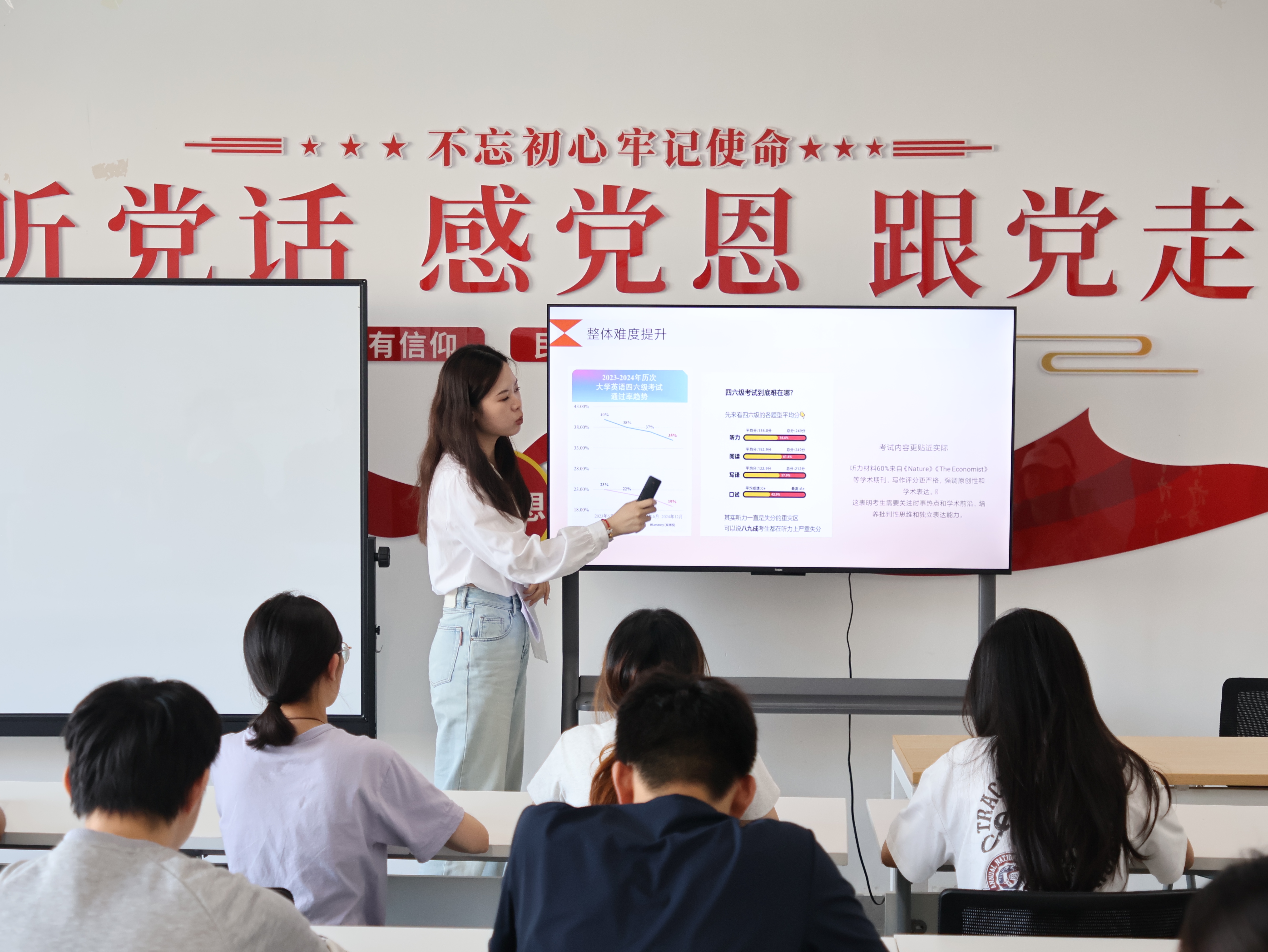 活动伊始,李慧秋老师立足近年四六级考试动态,系统梳理了各题型特点与备考重难点。她特别强调基础积累与应试技巧并重的备考理念,针对不同英语水平的学生,分别提出了阶梯式提升方案,为在场同学指明了冲刺方向。