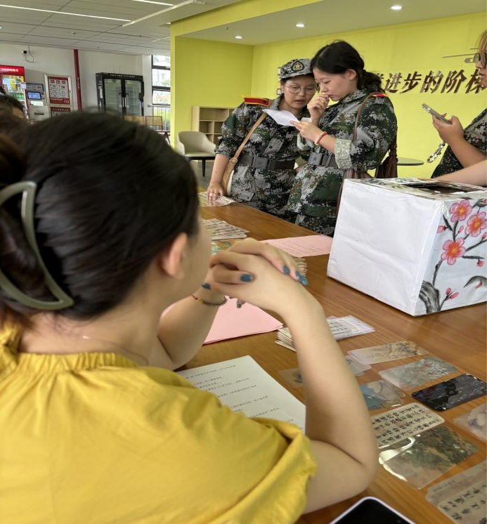 活动伊始,同学们从宿管会工作人员处随机抽取“书画碎片”,凭借自身知识储备及敏锐的洞察力,识别碎片所对应的完整书画作品名称、作者以及所属年代。对于有难度的内容,同学们还可以带着碎片到宿舍区的文化墙作品中寻找答案。